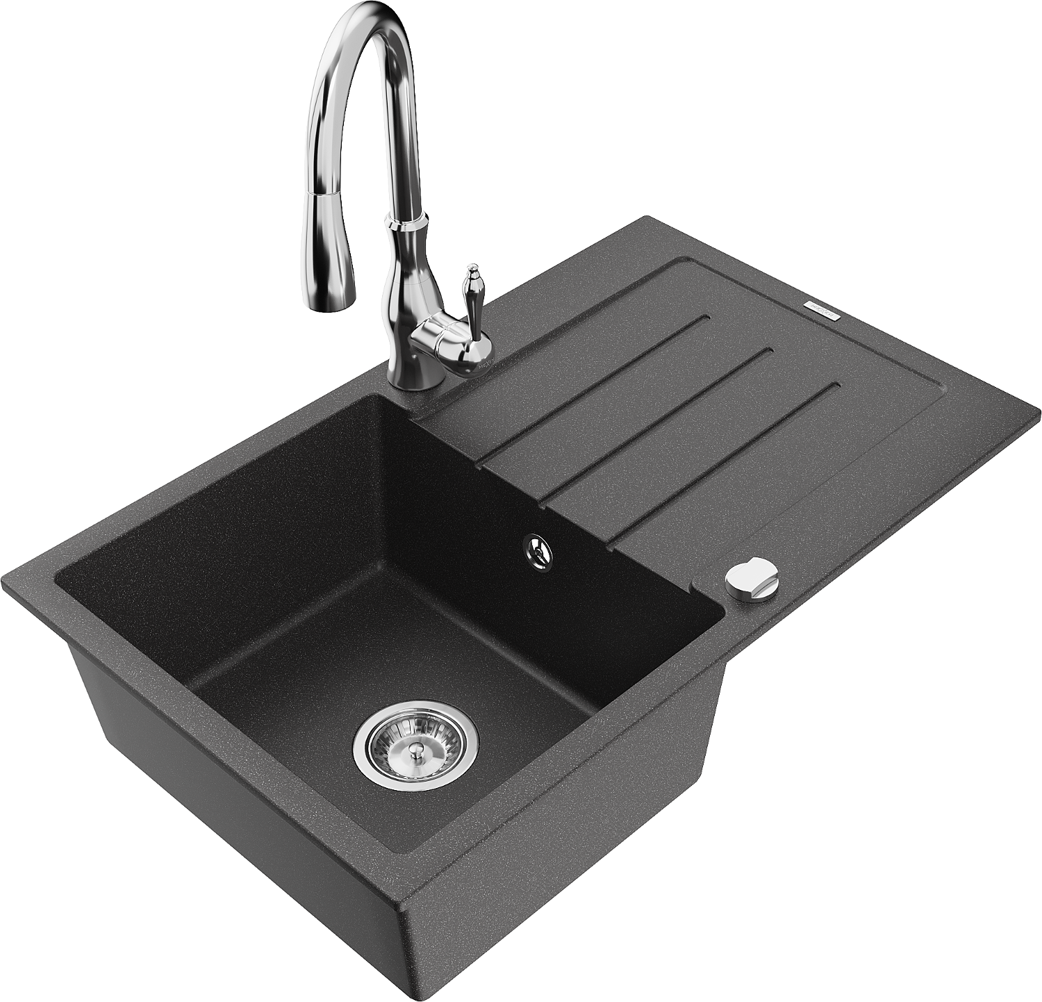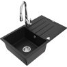 Mexen Bruno viena nodalījuma granīta izlietne ar noteces zonu un virtuves jaucējkrānu Savita, melna ar punktiem