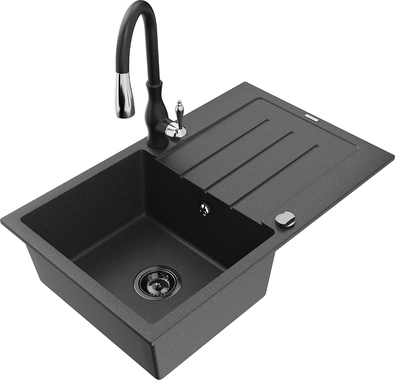 Mexen Bruno granīta izlietne ar vienu nodalījumu, ar noteces vietu un virtuves jaucējkrānu Savita, melna ar plankumiem