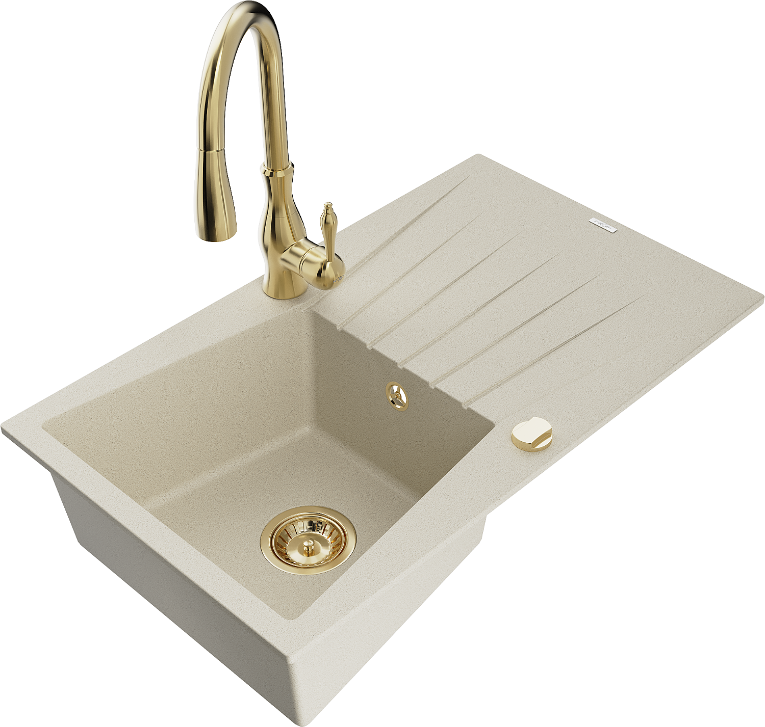 Mexen Cesar vienkameras granīta izlietne ar noteces paneli un virtuves jaucējkrānu Savita, bēšs - 6514-69-672601-50