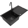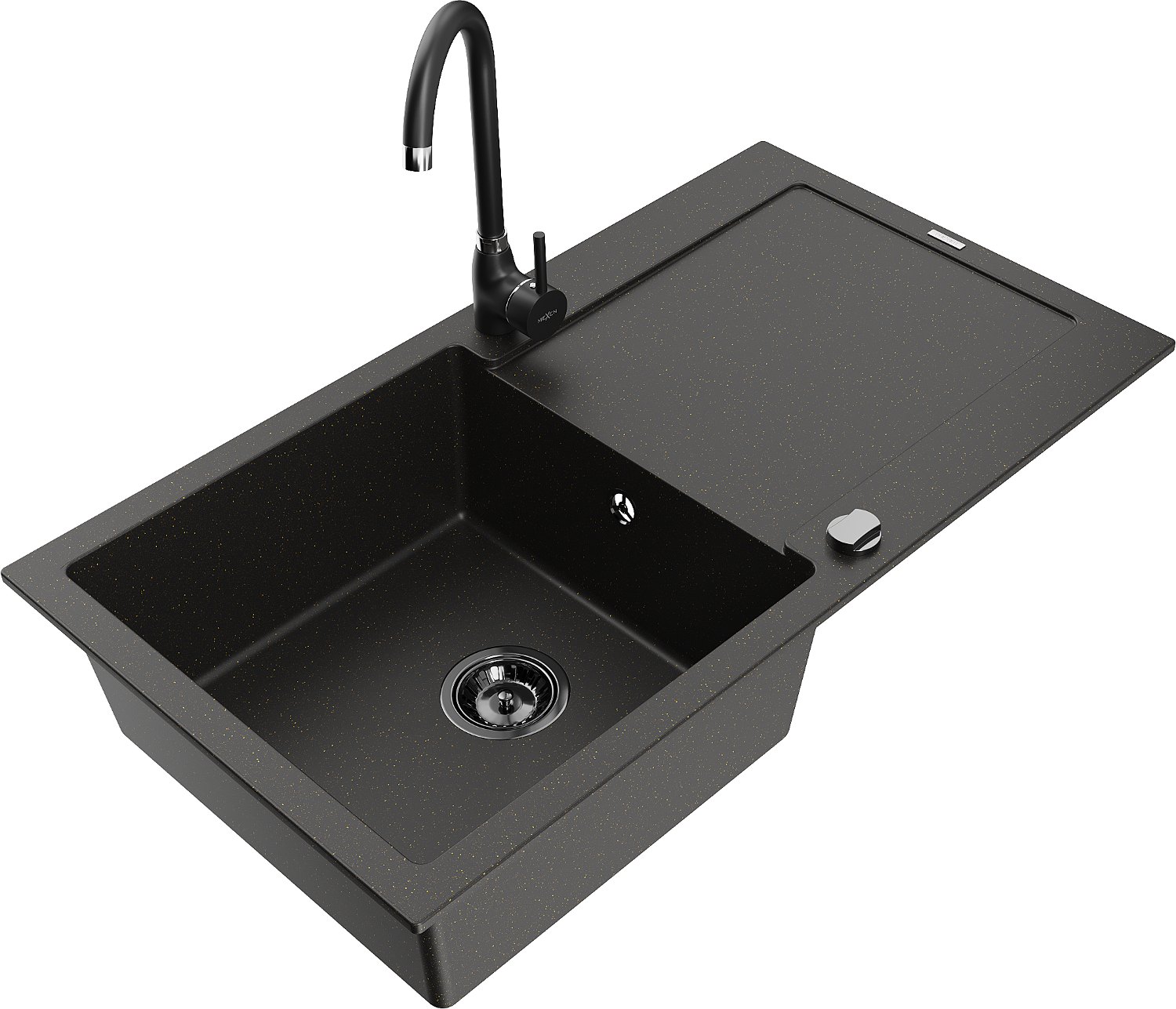 Mexen Leo granitizlietne ar vienu nodalījumu, noteces paliktni un virtuves jaucējkrānu Telma, melns/zelts metalik