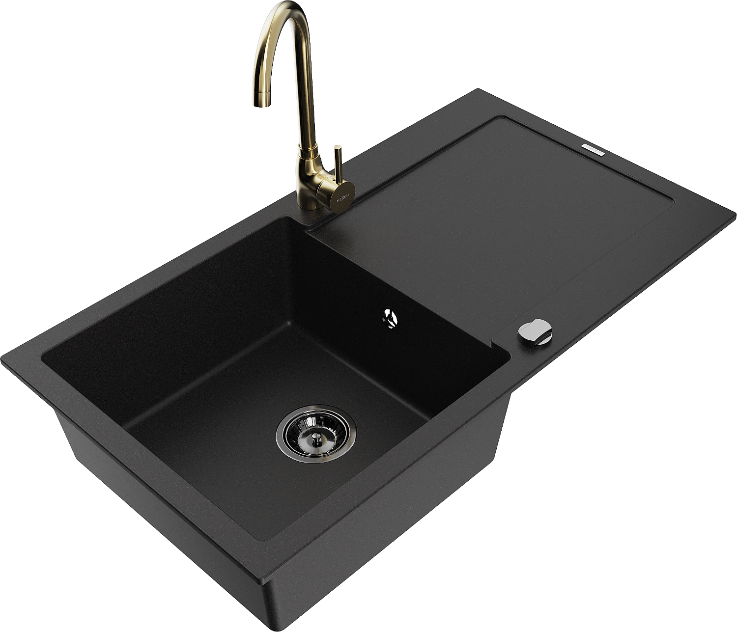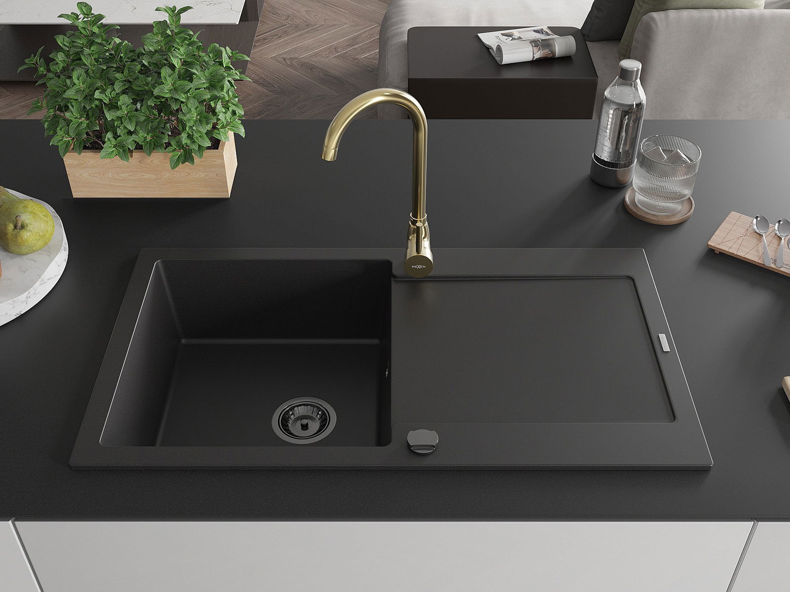 Mexen Leo granīta izlietne ar vienu nodalījumu, ar noteces zonu un virtuves jaucējkrānu Telma, melna - 6501-77-670200-50-B