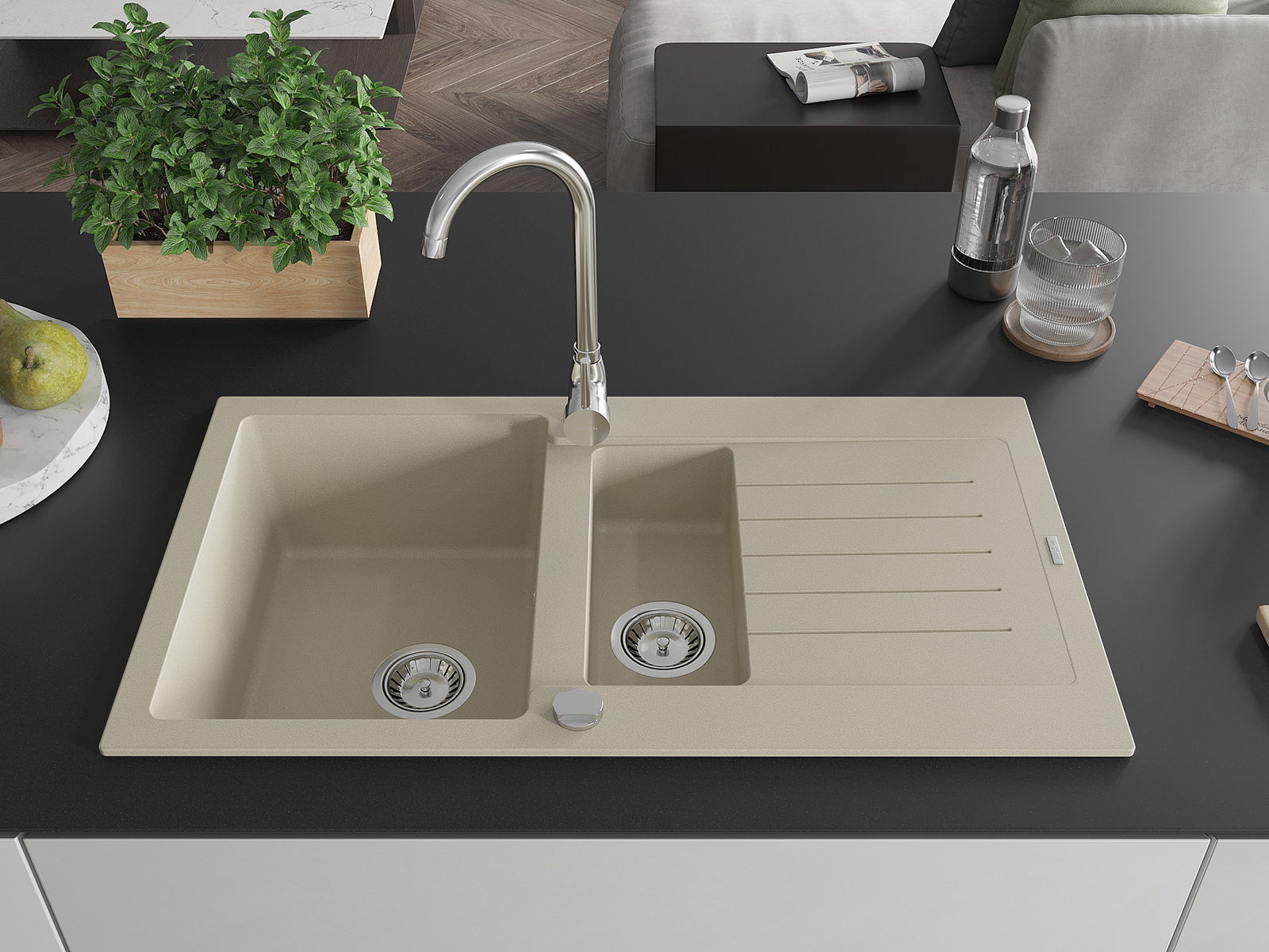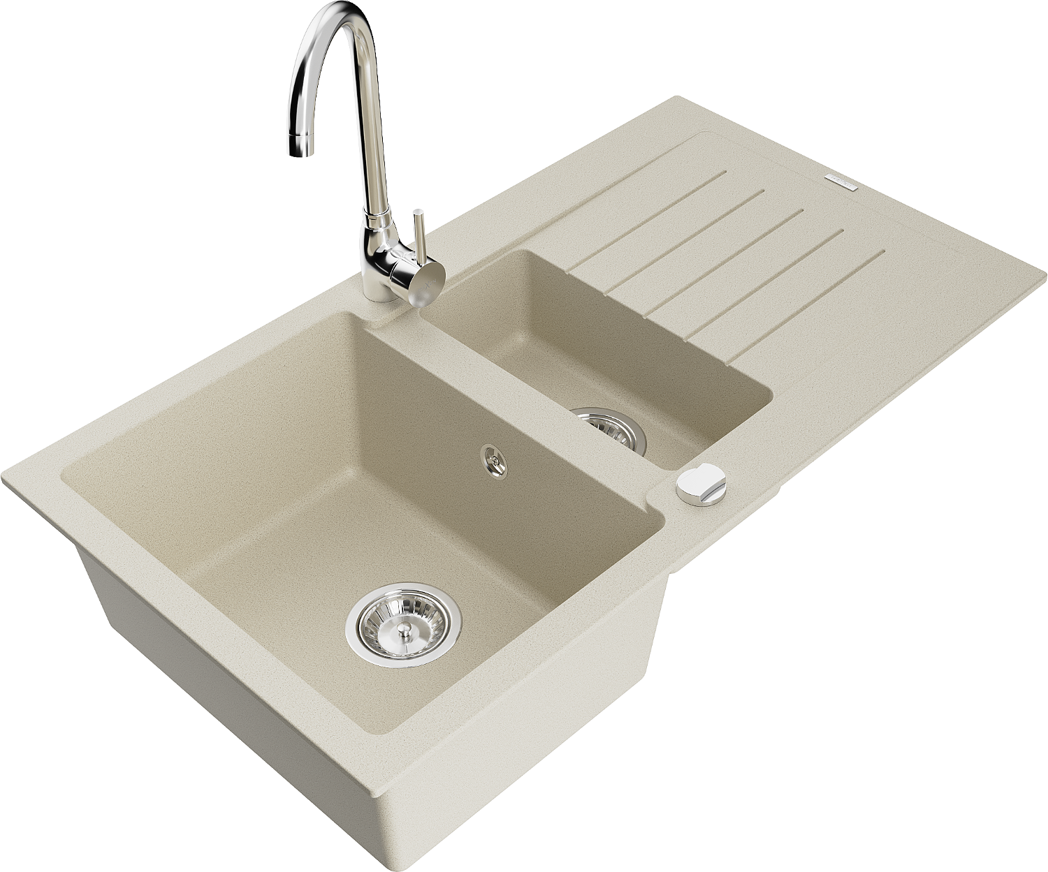 Mexen Matias granitizlietne ar 1,5 nodalījumiem ar noteci un virtuves jaucējkrānu Telma, bēšs - 6502-69-670200-00