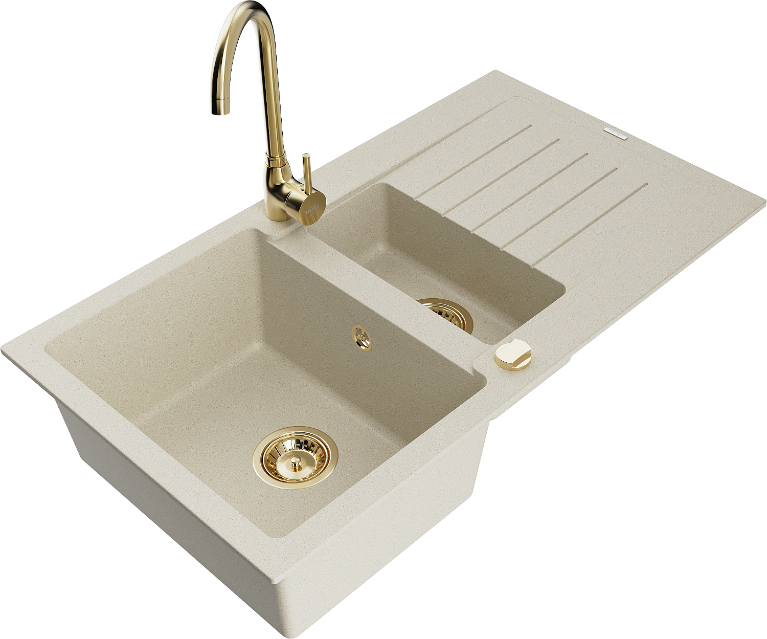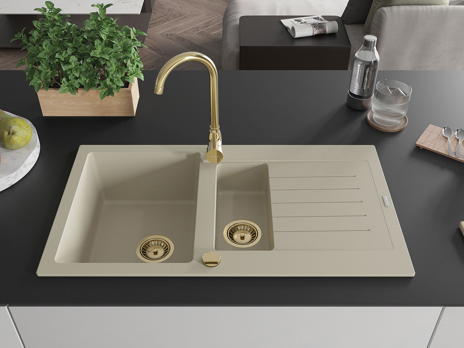 Mexen Matias granīta izlietne ar 1,5 nodalījumu, ar noteces un virtuves jaucējkrānu Telma, bēšs - 6502-69-670200-50