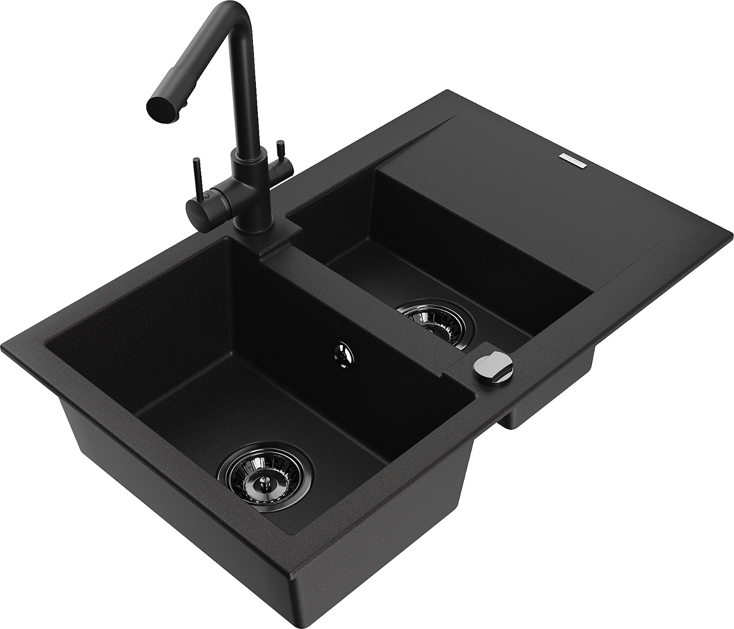 Mexen Gaspar granitais izlietne ar 1,5 nodalījumiem un noteka un virtuves jaucējkrānu Duero, melna - 6507-77-671600-70-B