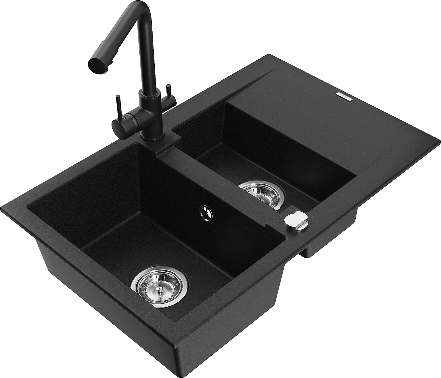 Mexen Gaspar granitā izlietne ar 1,5 bļodām un noteku, un virtuves jaucējkrānu Duero, melna - 6507-77-671600-70