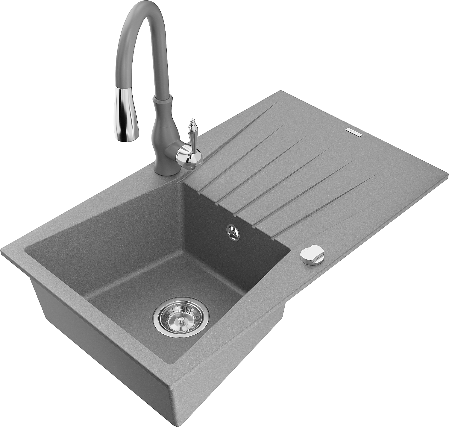 Mexen Cesar granit izlietne ar vienu nodalījumu ar noteces vietu un virtuves jaucējkrānu Savita, pelēks - 6514-71-672601-71