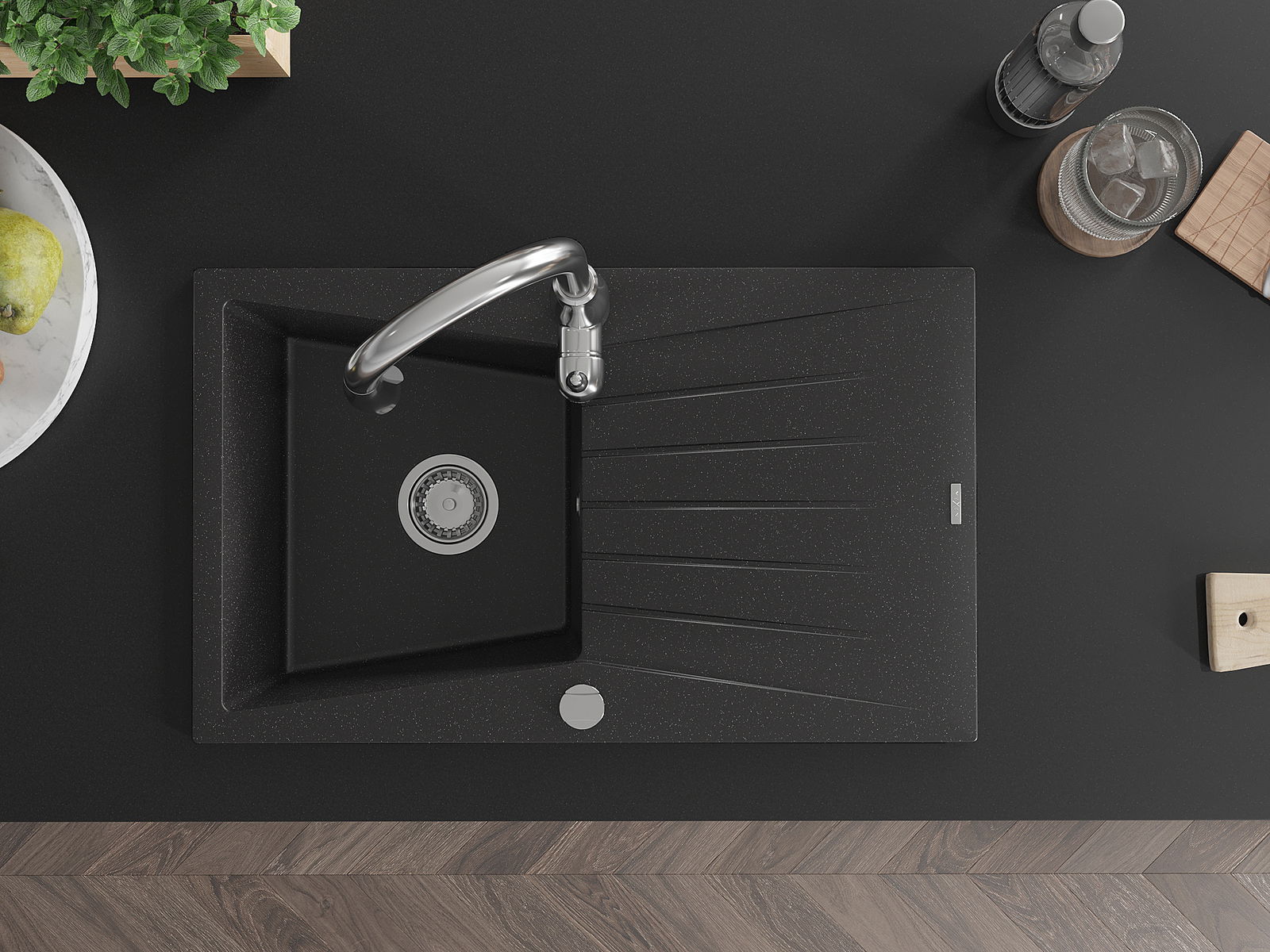 Mexen Cesar granitē izlietne ar vienu nodalījumu, ar noteces funkciju un virtuves jaucējkrānu Savita, melna/sudraba