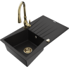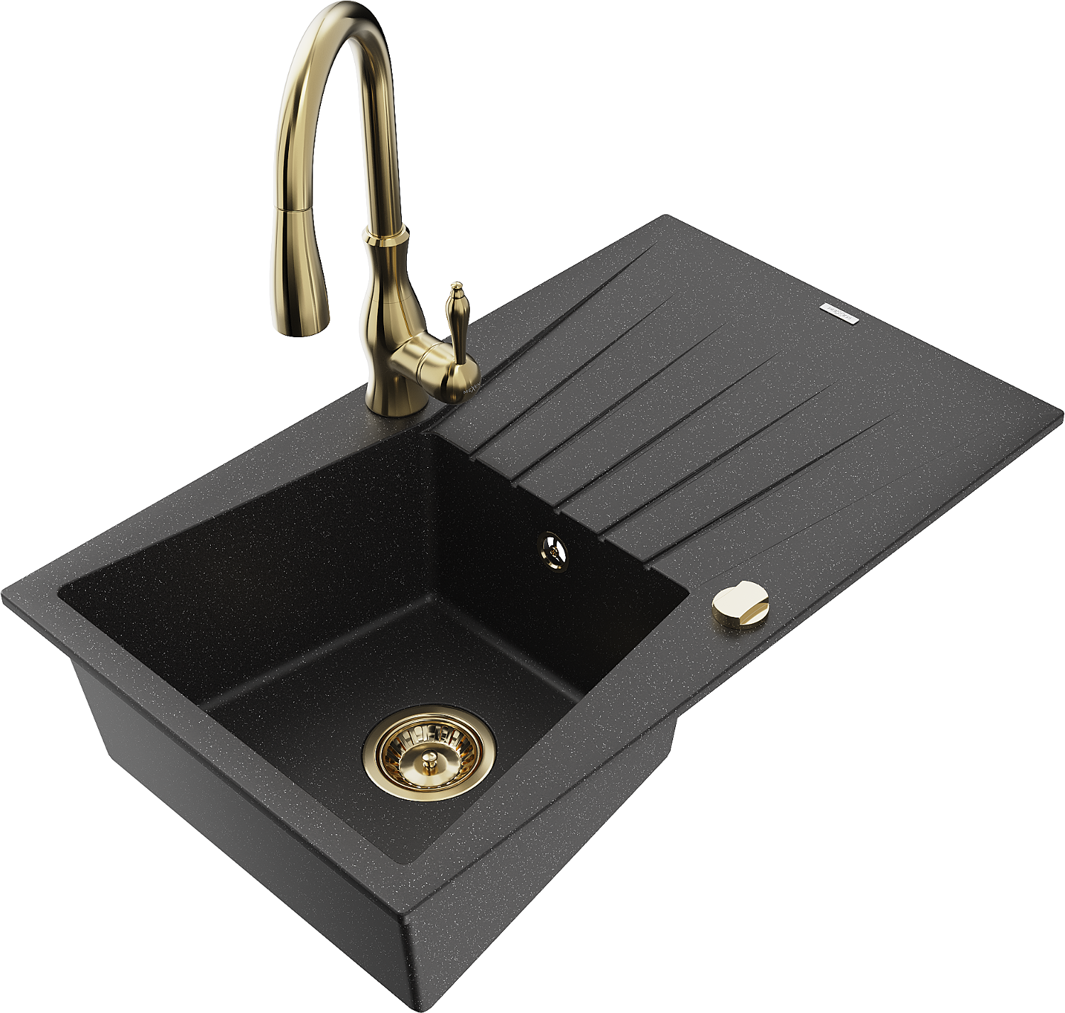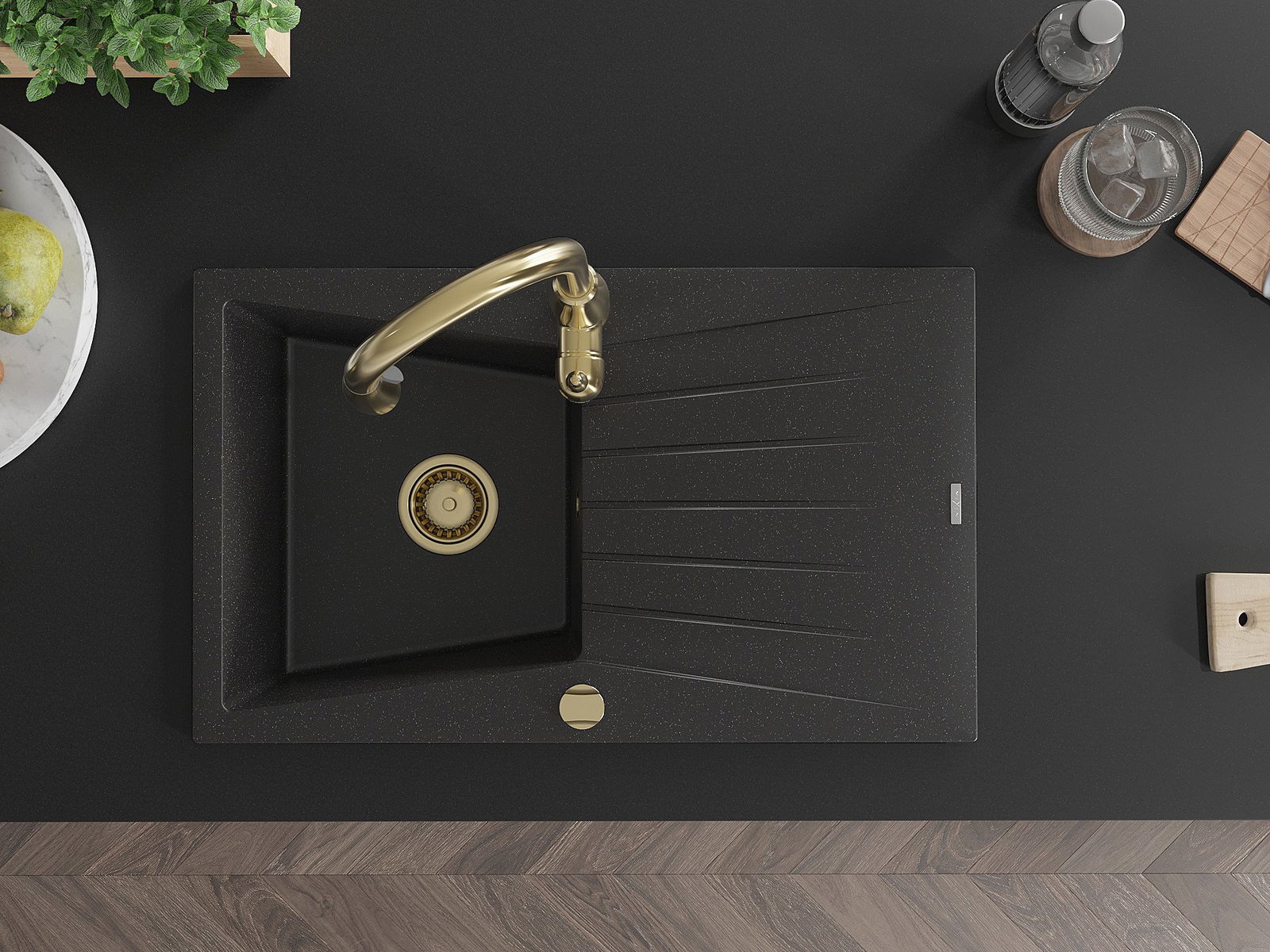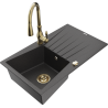 Mexen Cesar granīta izlietne ar vienu nodalījumu, ar noteku un virtuves jaucējkrānu Savita, melns/sudraba metālika
