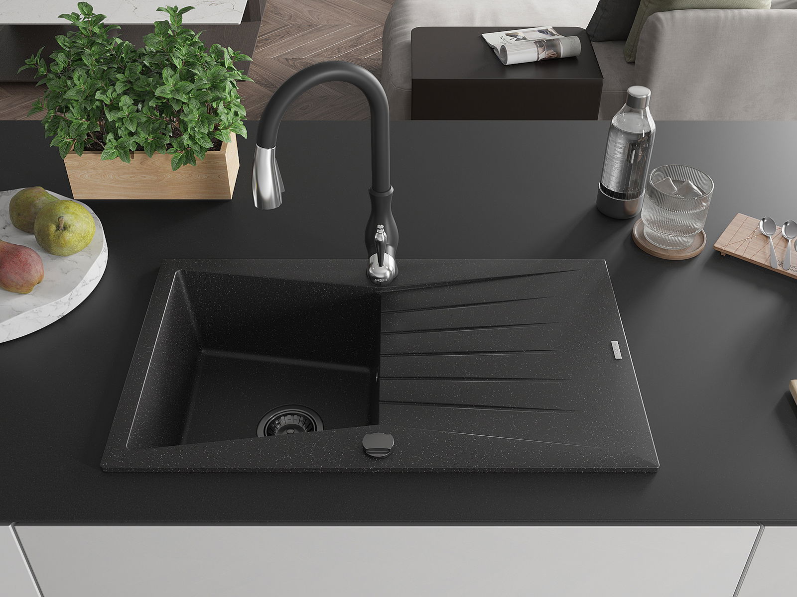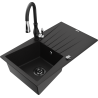 Mexen Cesar granitizlietne ar 1 nodalījumu, ar noteces un virtuves jaucējkrānu Savita, melnā/sudraba - 6514-73-672601-70-B