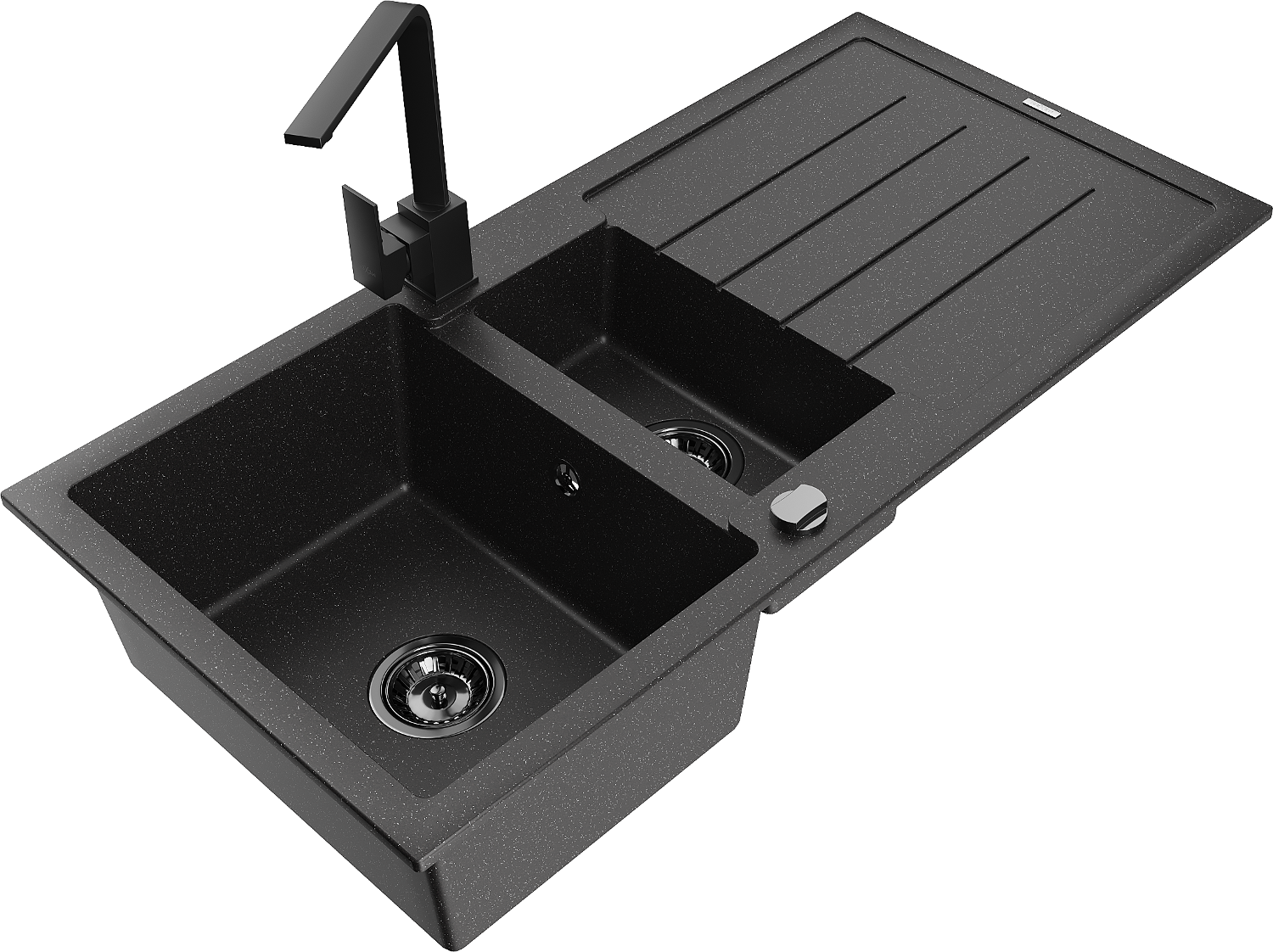 Mexen Andres granīta izlietne ar 1,5 nodalījumiem, žāvētāju un virtuves jaucējkrānu Rita, melna/sudraba