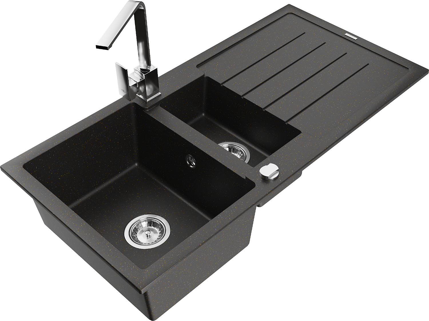 Mexen Andres granīta izlietne ar 1,5 nodalījumiem, ar noteku un virtuves jaucējkrānu Rita, melna/zeltīta metālika