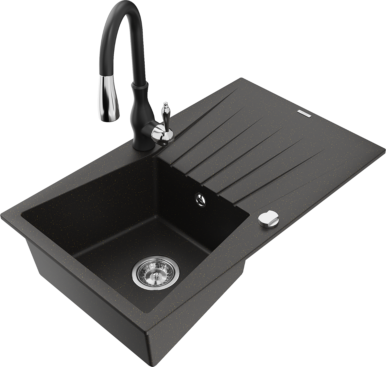 Mexen Cesar granitizlietne ar vienu nodalījumu ar notecinātāju un virtuves krānu Savita, melna/zelta metāliks