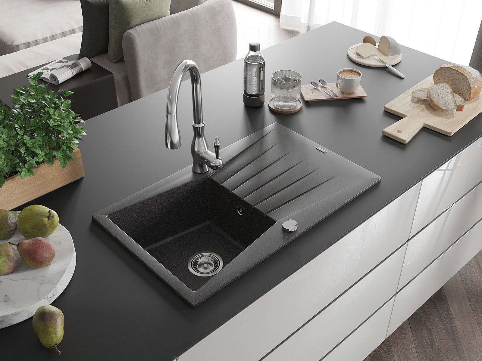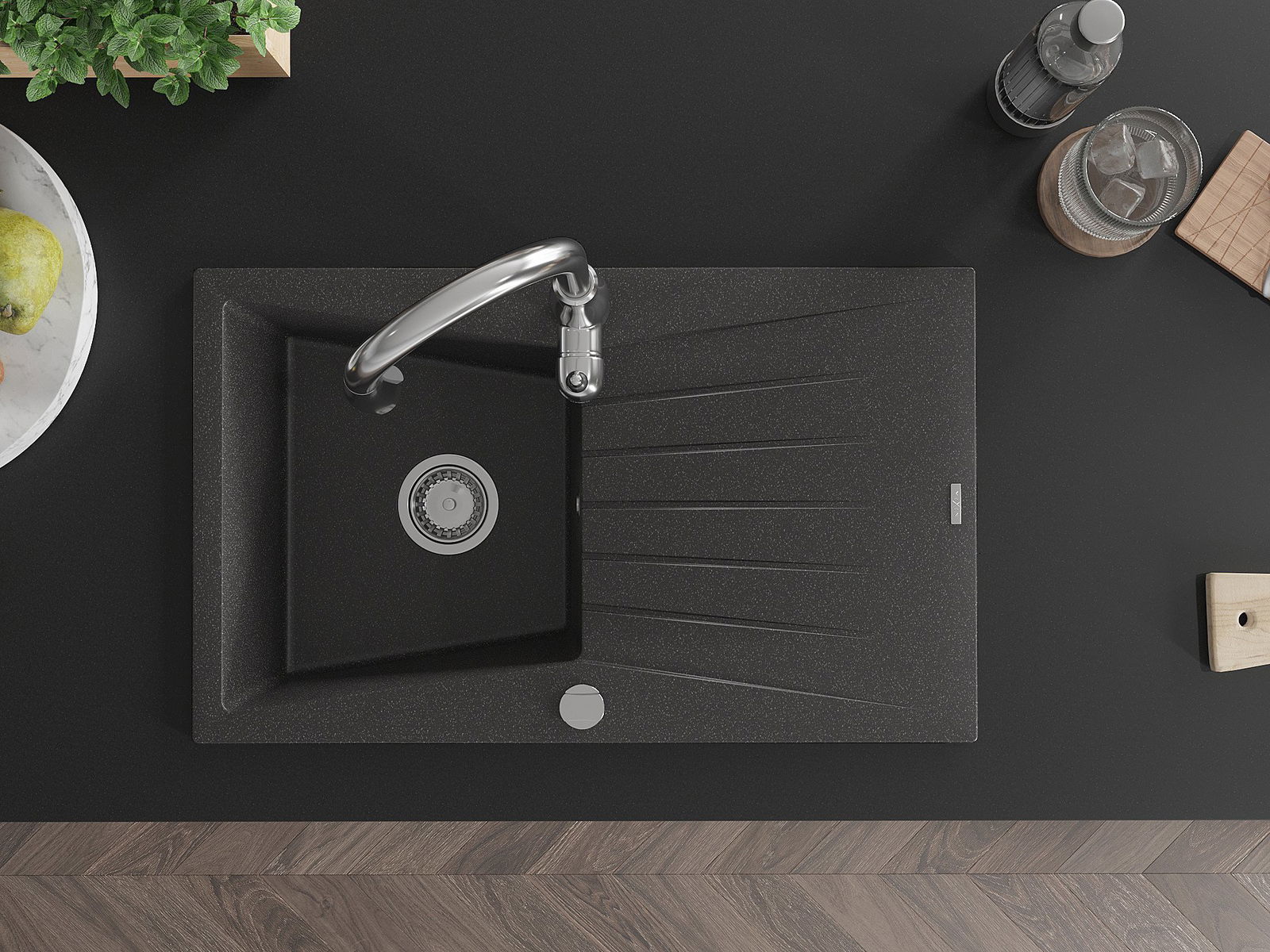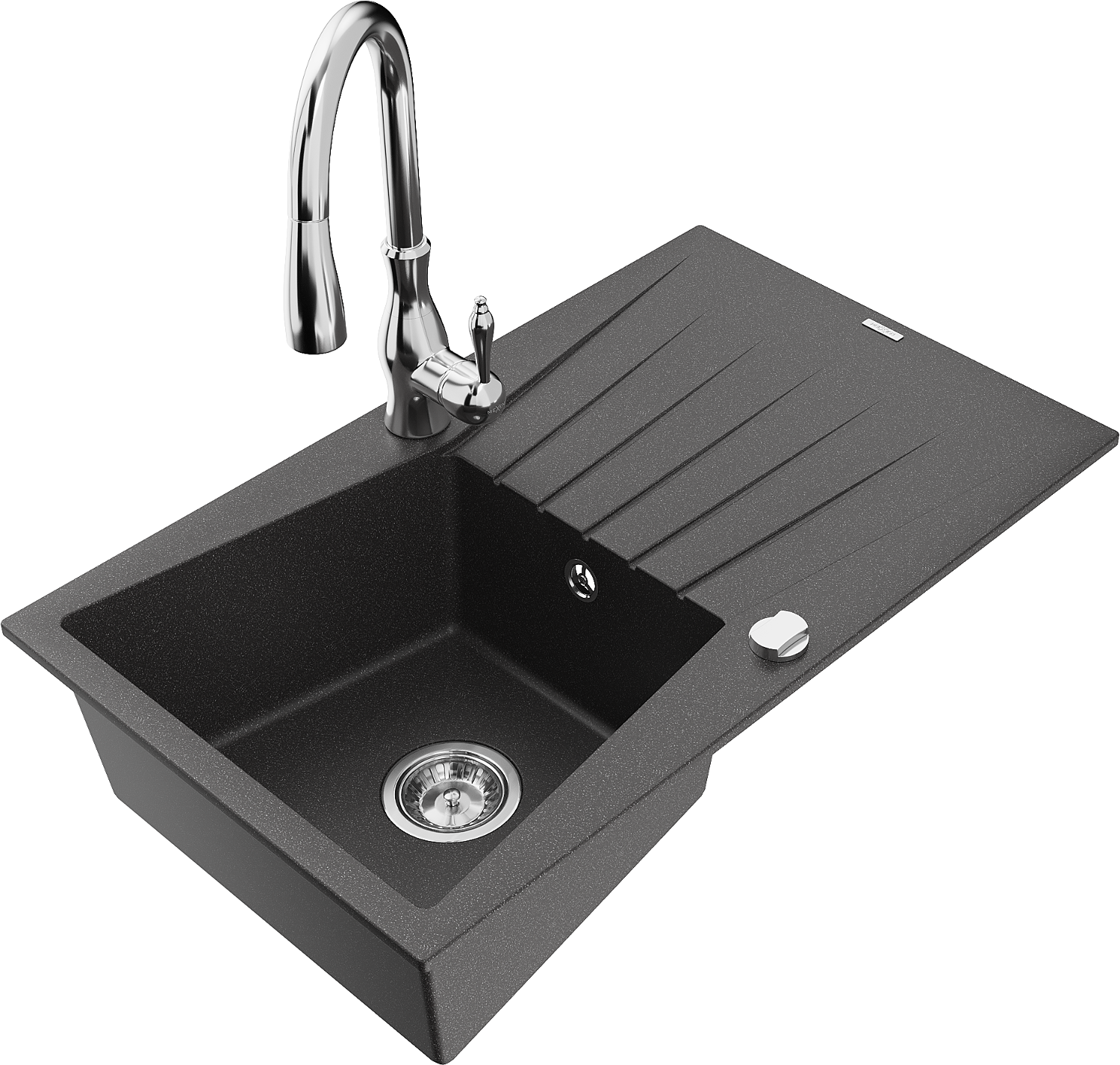 Mexen Cesar grīda granīta izlietne ar vienu kameru un nosūcēju, kā arī virtuves jaucējkrānu Savita, melna ar pilieniem