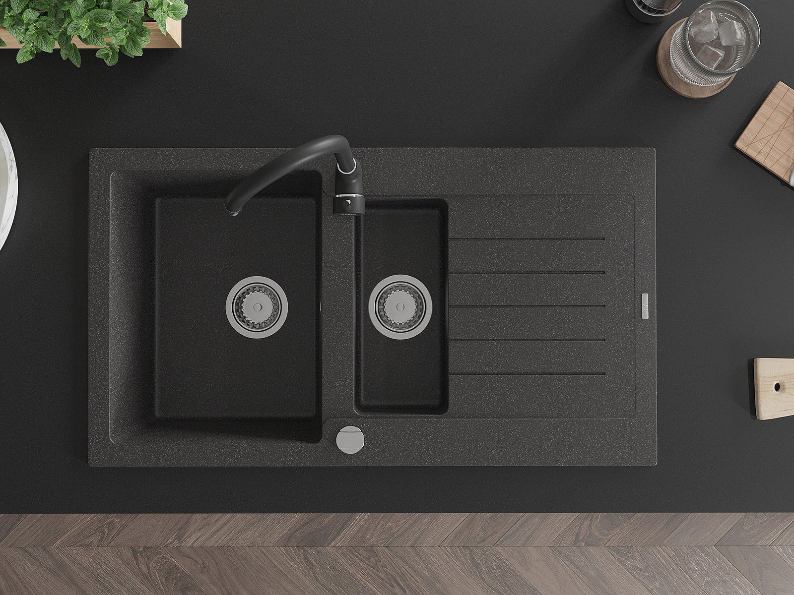 Izlietnei ir 2 daļēji izurbtas atveres ar diametru 35 mm, kuras var pašrocīgi izsist. Tās var izmantot, piemēram, šķidruma dozatora uzstādīšanai, kas novērsīs plastmasas pudeļu klātbūtni virtuvē un piešķirs tai elegantu apdari.