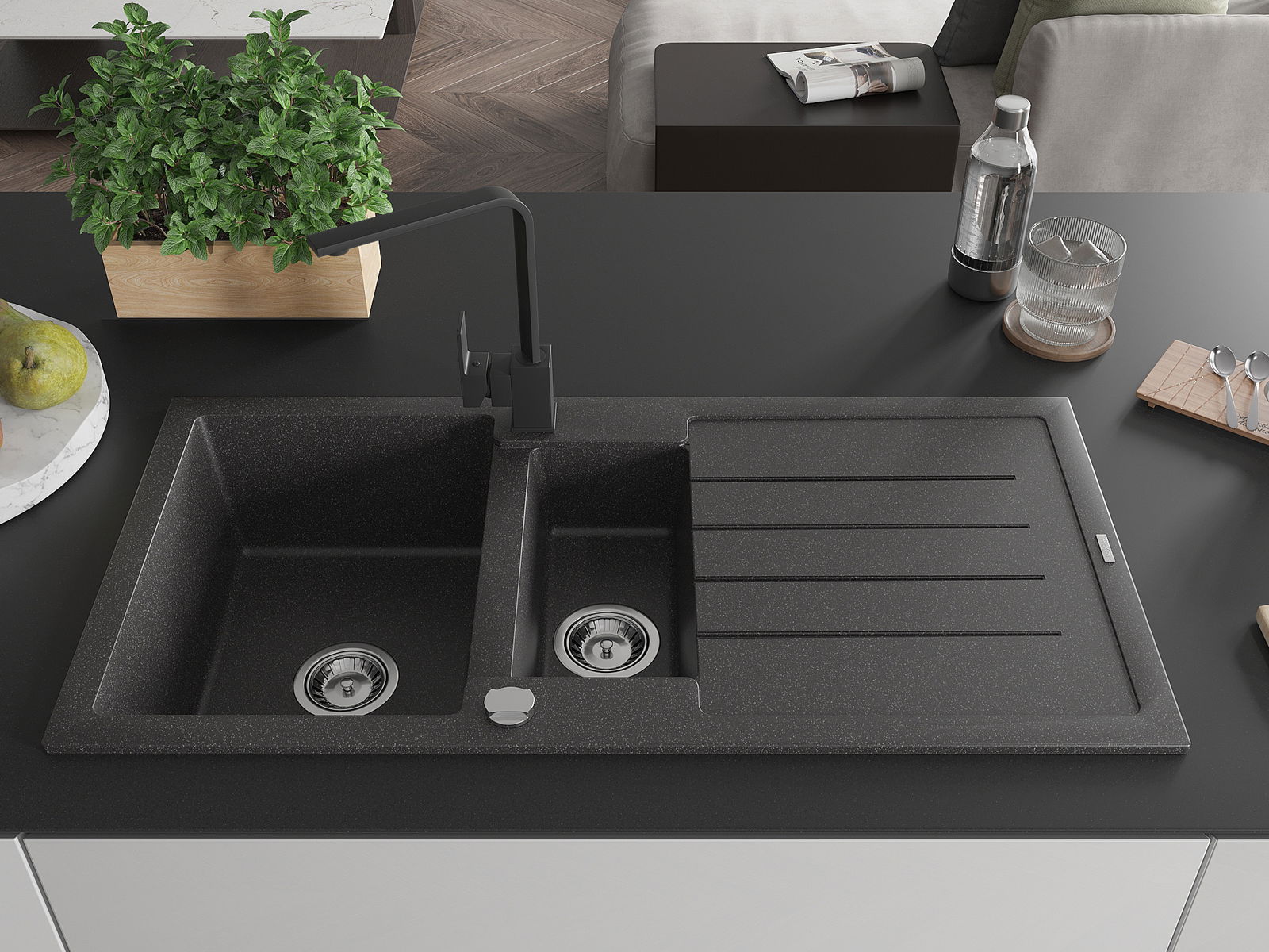 Mexen Andres granitizlietne ar 1,5 nodalījumiem ar žāvētāju un virtuves jaucējkrāns Rita, melns raibs - 6515-76-670300-70
