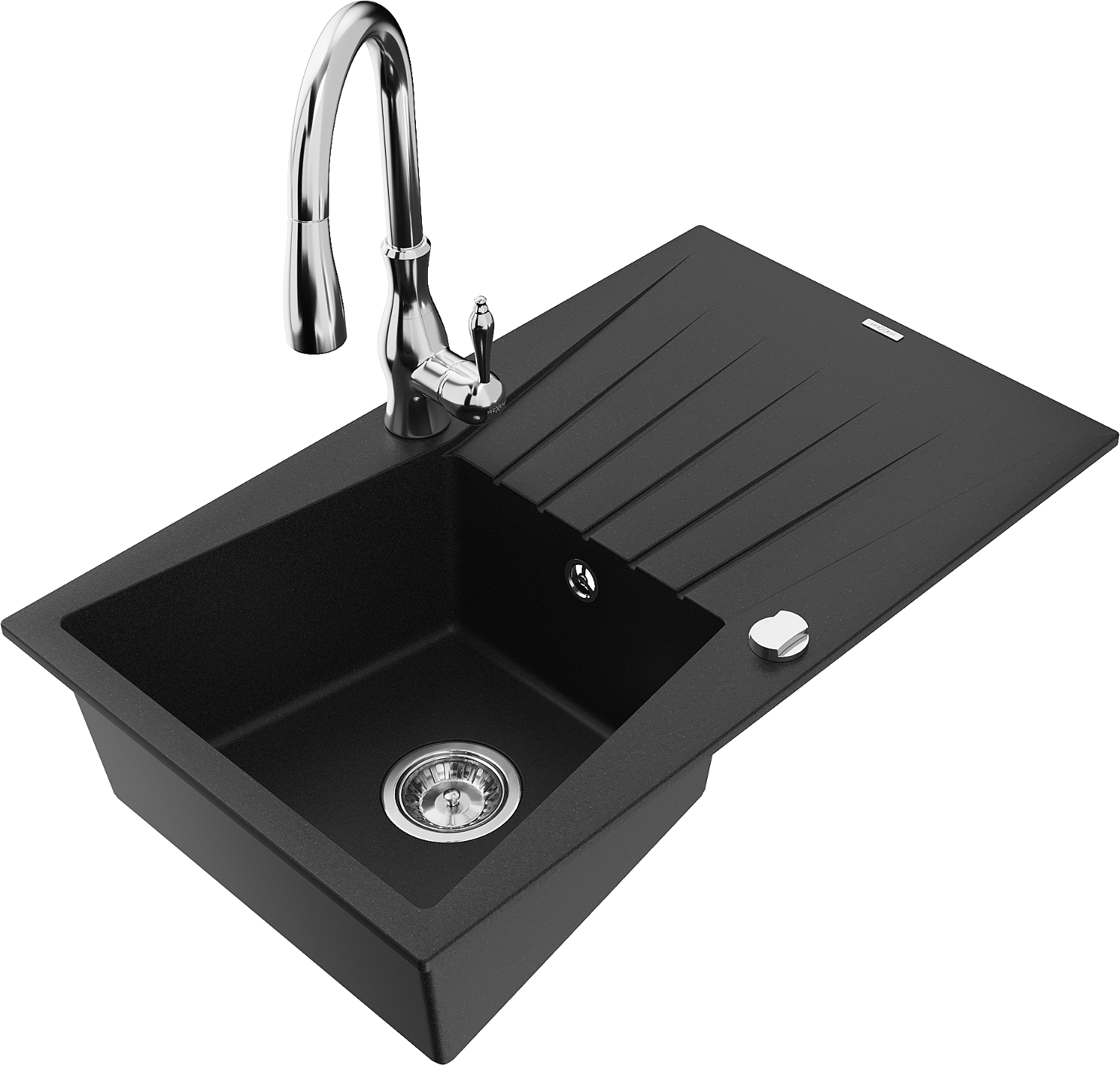 Mexen Cesar granitveida izlietne ar vienu nodalījumu un noteku un virtuves jaucējkrānu Savita, melns - 6514-77-672601-00