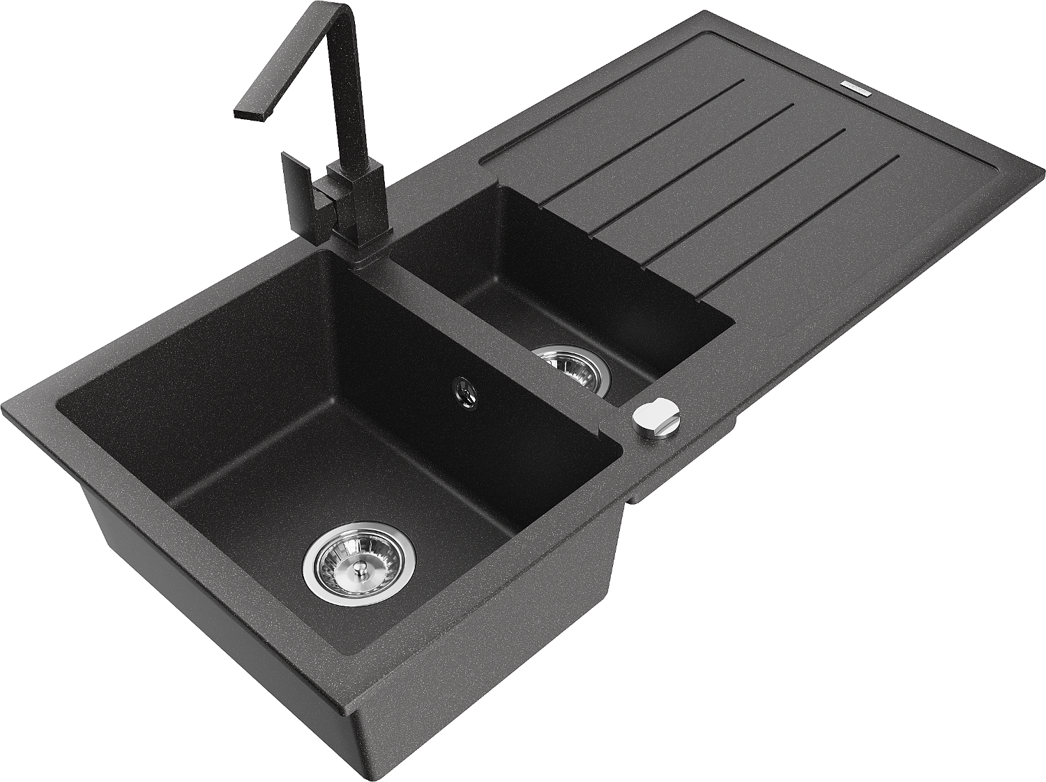 Mexen Andres granit izlietne ar 1,5 nodalījumiem, ar notekas un virtuves jaucējkrānu Rita, melna ar punktiem - 6515-76-670300-76
