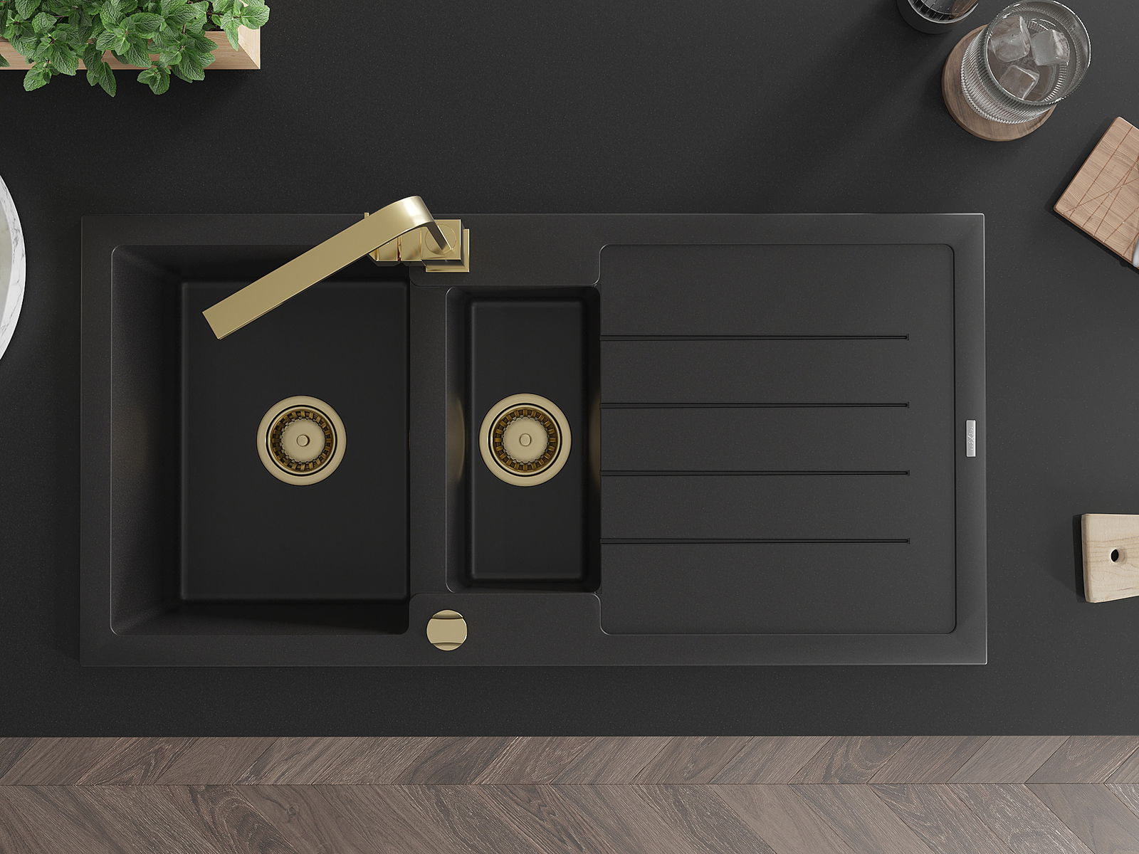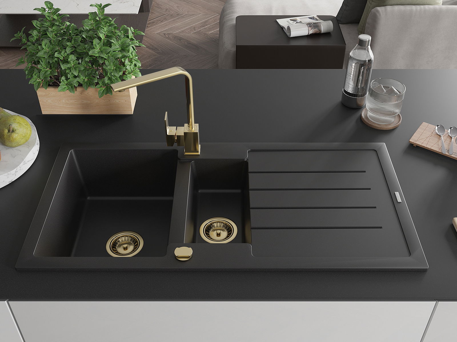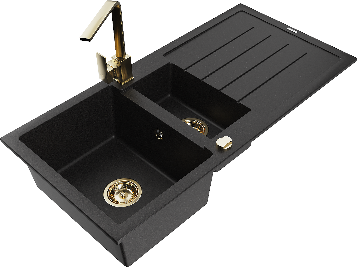 Mexen Andres granitā izlietne ar 1,5 nodalījumiem, ar noteku un virtuves jaucējkrānu Rita, melna - 6515-77-670300-50