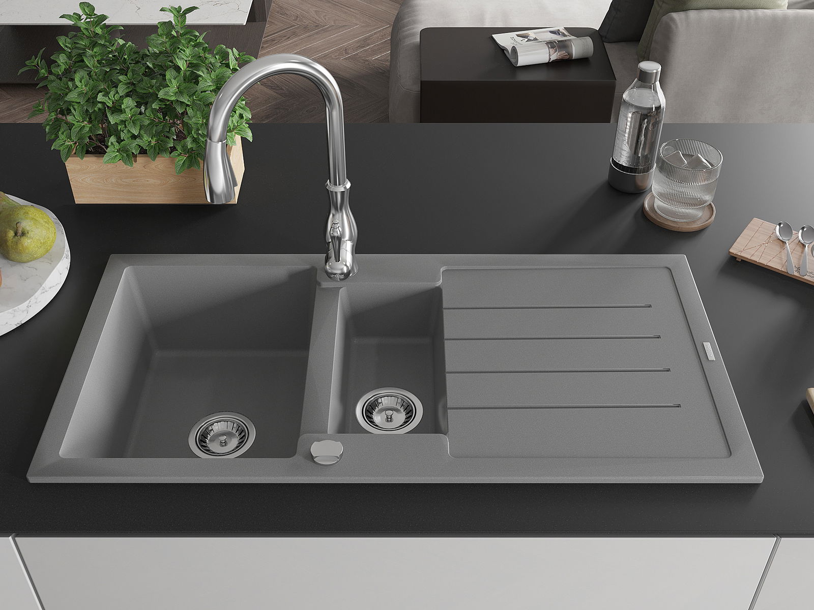 Mexen Andres granitā izlietne 1,5 nodalījuma ar noteci un virtuves jaucējkrānu Savita, pelēka - 6515-71-672601-00