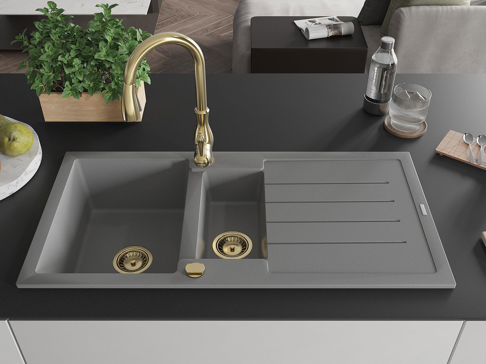 Mexen Andres granitizlietne 1,5 kameru ar noteku un virtuves krānu Savita, pelēks - 6515-71-672601-50