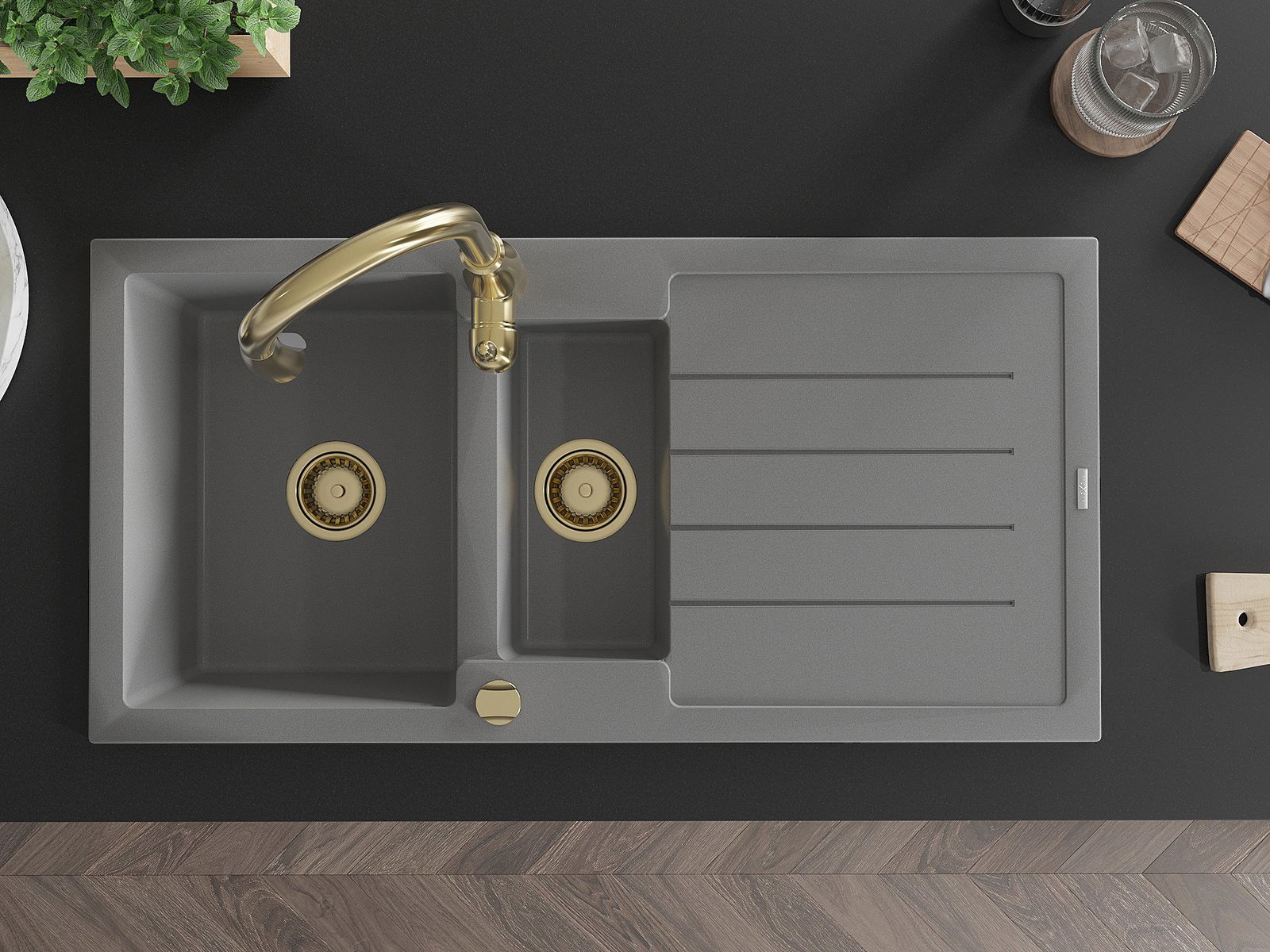 Izlietnei ir 2 daļēji izurbtas atveres ar diametru 35 mm, kuras var pašrocīgi izsist. Tās var izmantot, piemēram, šķidruma dozatora uzstādīšanai, kas novērsīs plastmasas pudeļu klātbūtni virtuvē un piešķirs tai elegantu apdari.