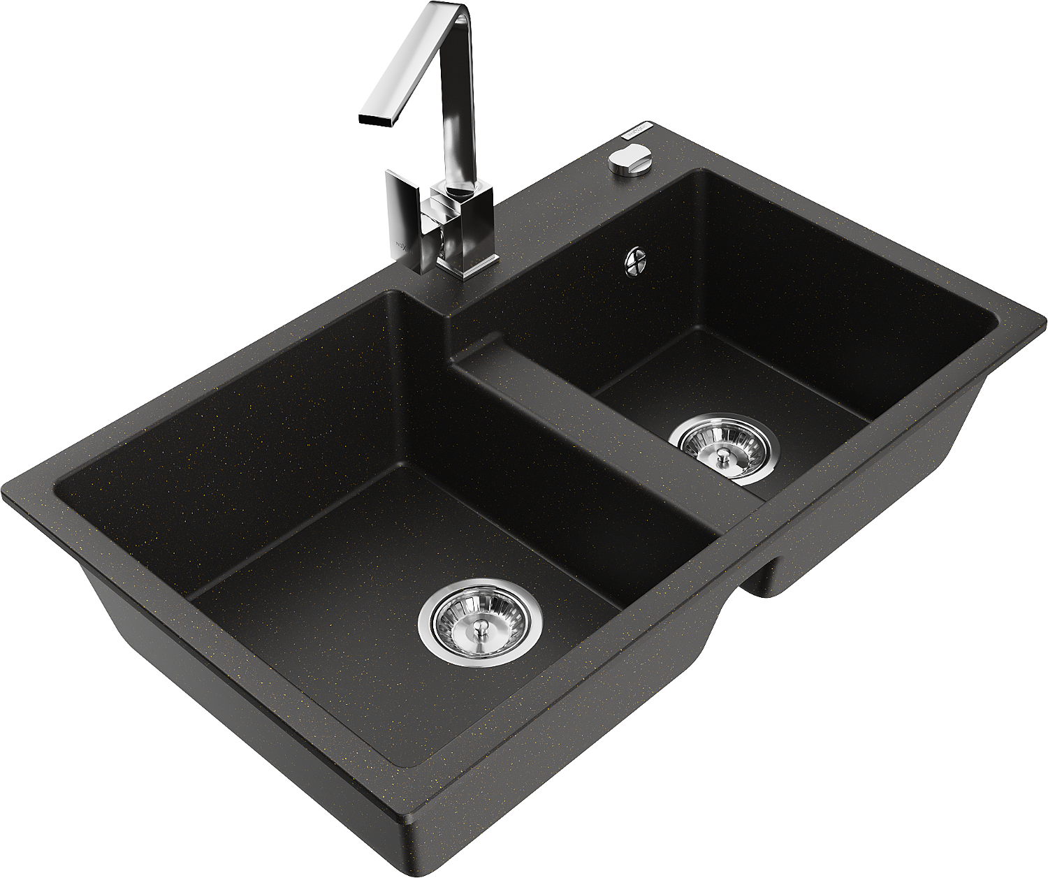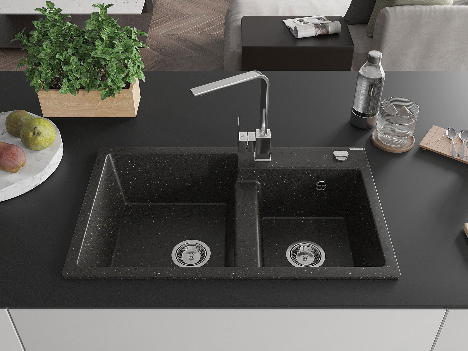 Mexen Tomas granitlējums virtuves izlietne ar 2 kamerām un Rita jaucējkrānu, melna/zeltīta metāliska - 6516-75-670300-00