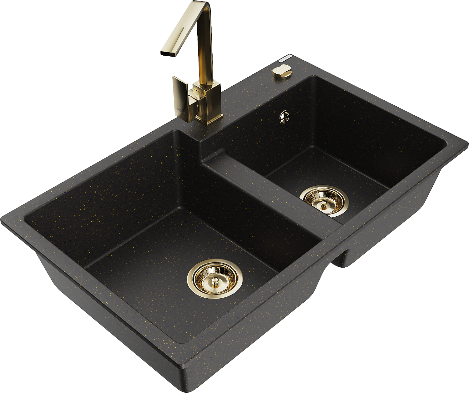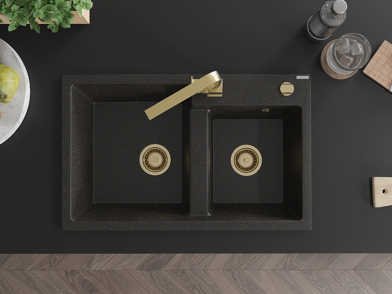 Mexen Tomas divu nodalījumu granīta izlietne ar virtuves jaucējkrānu Rita, melna/zeltīta metāliska - 6516-75-670300-50