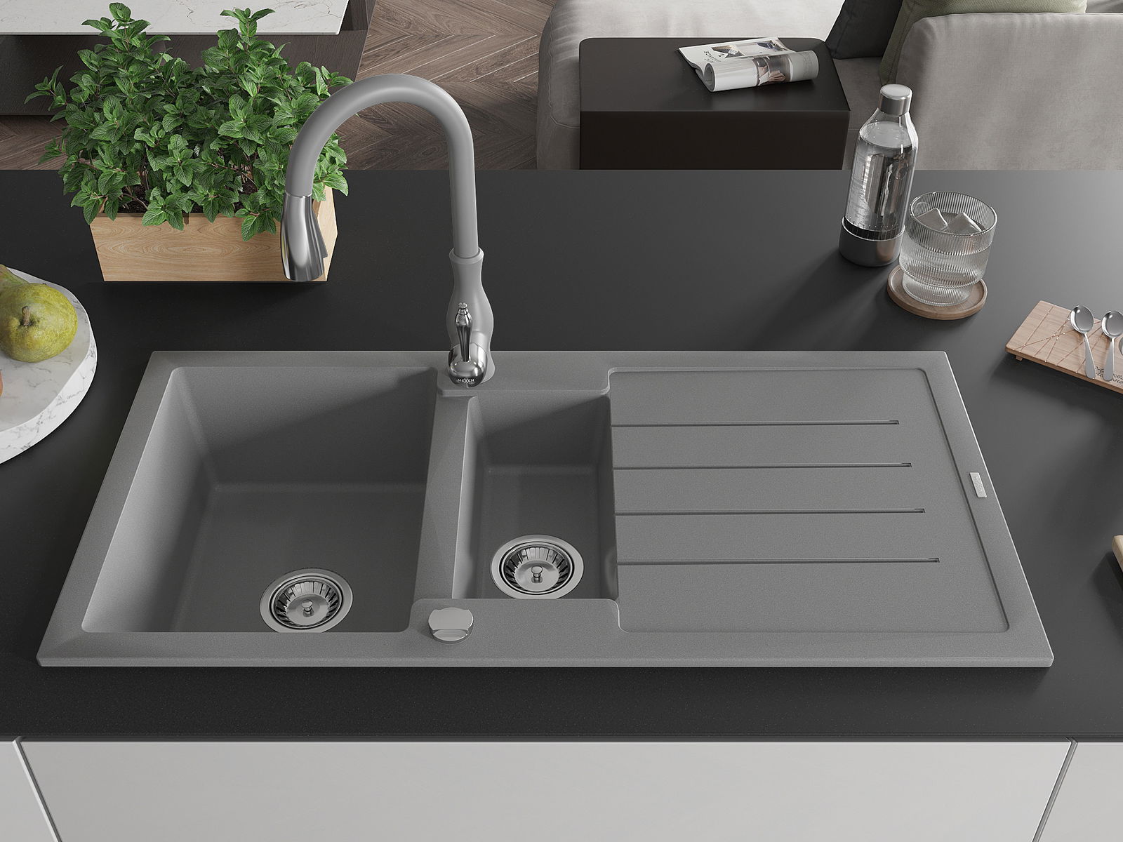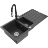 Mexen Andres granīta izlietne ar 1,5 nodalījumiem, notecinātāju un virtuves krānu Savita, pelēka - 6515-71-672601-71
