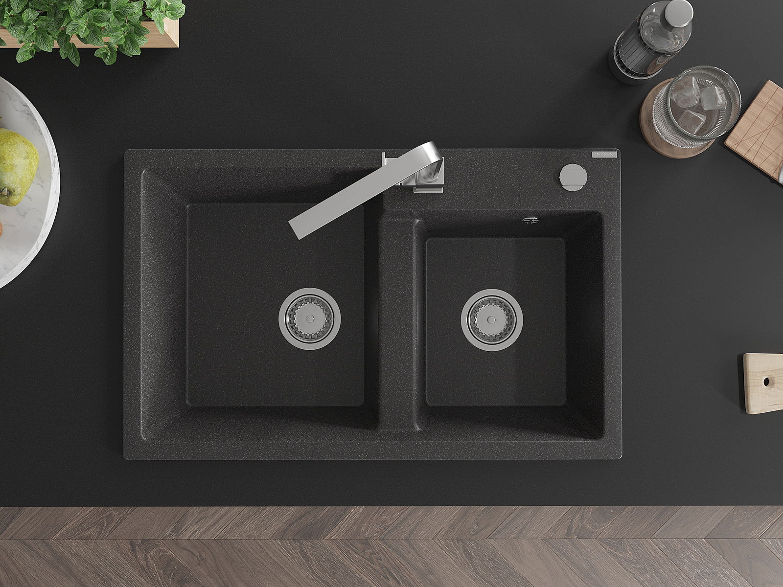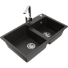 Mexen Tomas granit izlietne ar divām nodalījumiem un virtuves jaucējkrānu Rita, melns ar plankumiem - 6516-76-670300-00