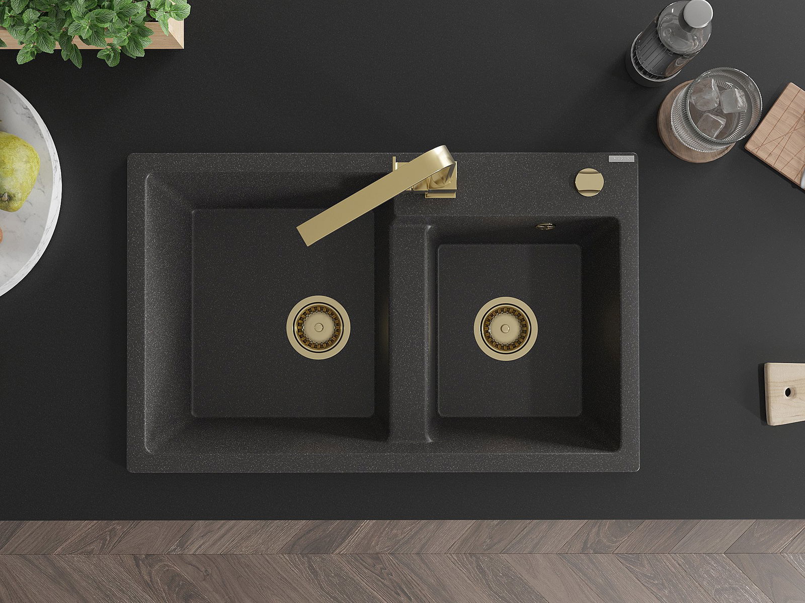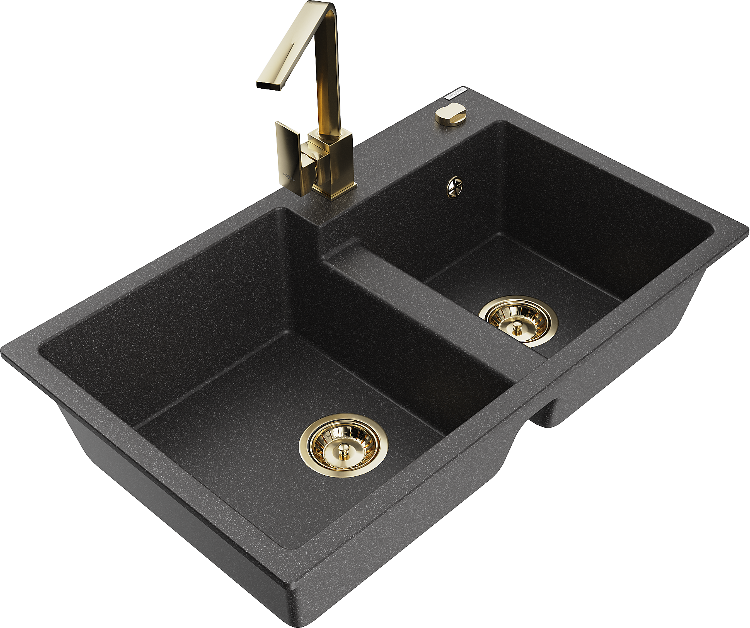 Mexen Tomas granitizlietne ar divām kamerām un virtuves krānu Rita, melns ar plankumiem - 6516-76-670300-50