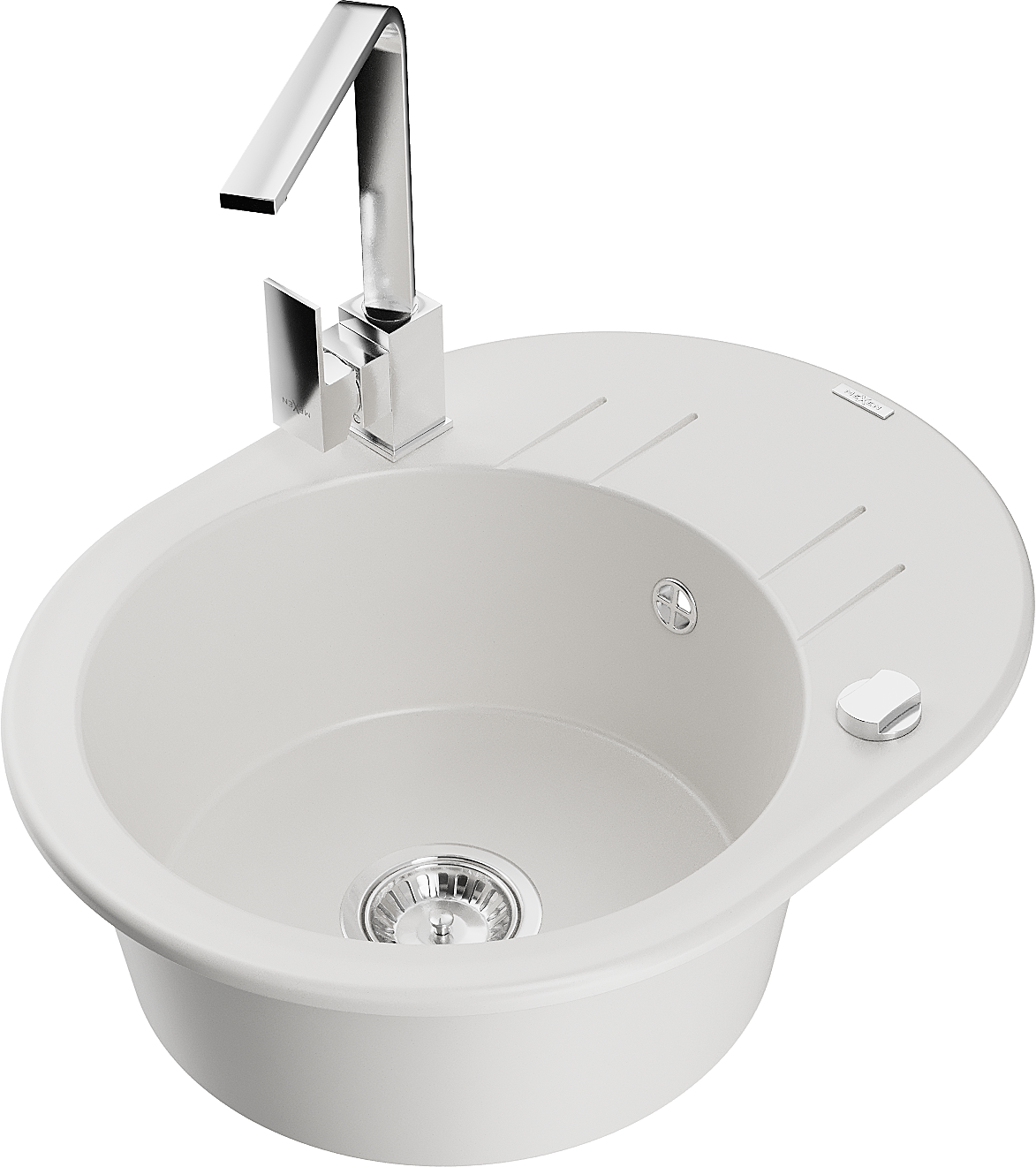 Mexen Kevin granitā izlietne ar vienu nodalījumu un noteces paliktni, un virtuves jaucējkrānu Rita, balta - 6517-20-670300-00