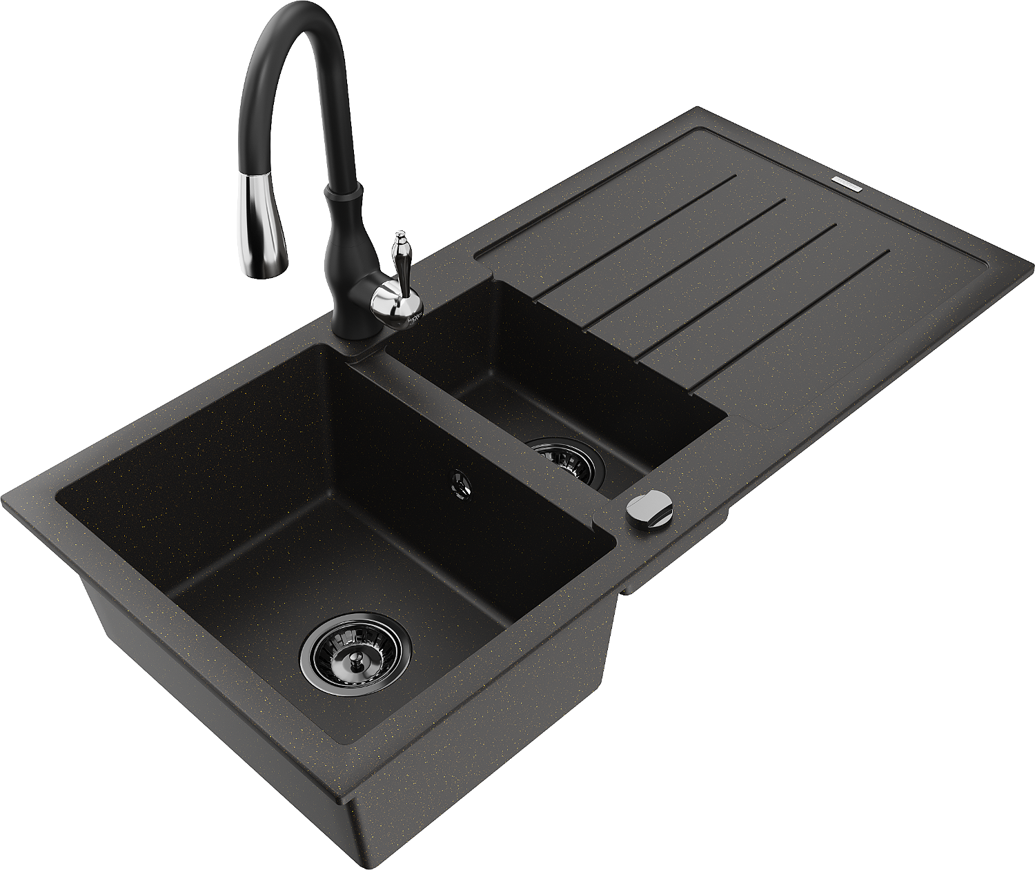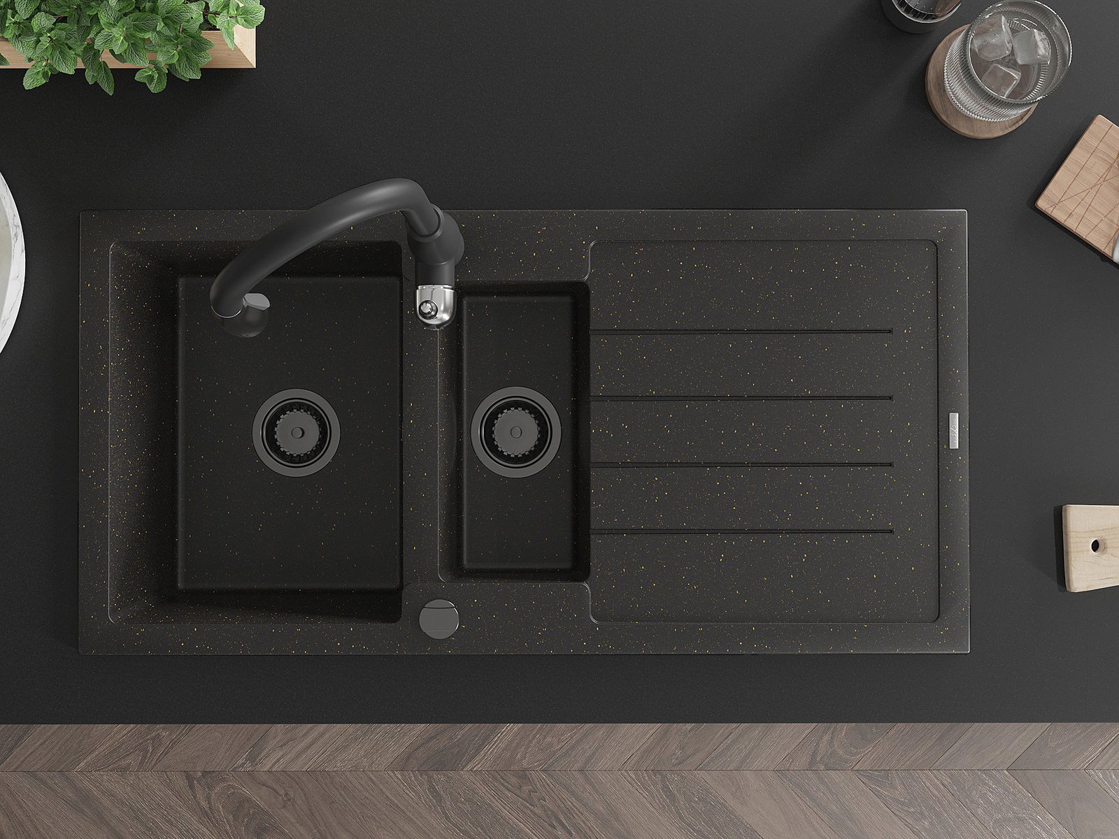 Mexen Andres 1,5 nodal granīta izlietne ar žāvētāju un virtuves jaucējkrānu Savita, melns/zeltains - 6515-75-672601-70-B