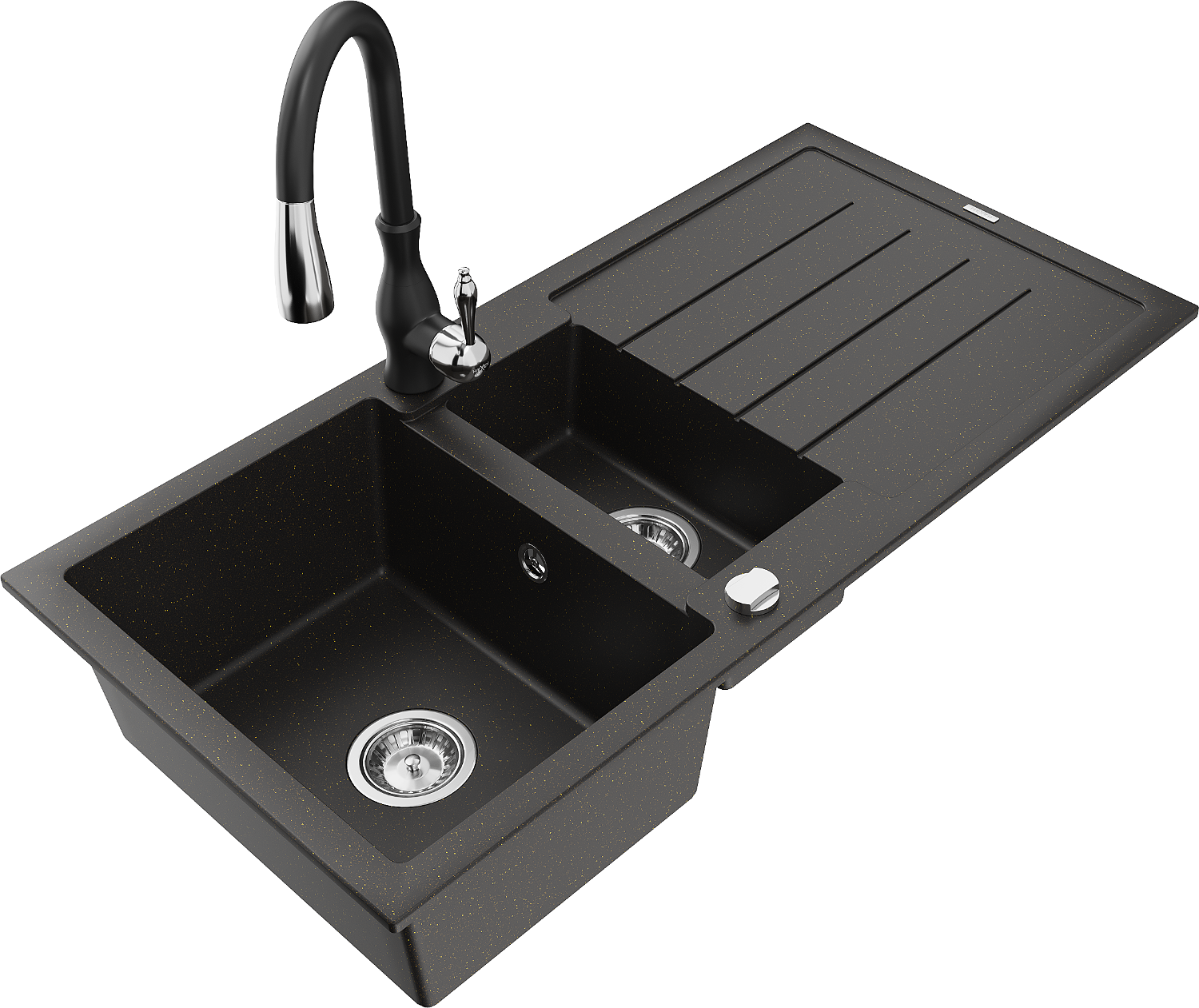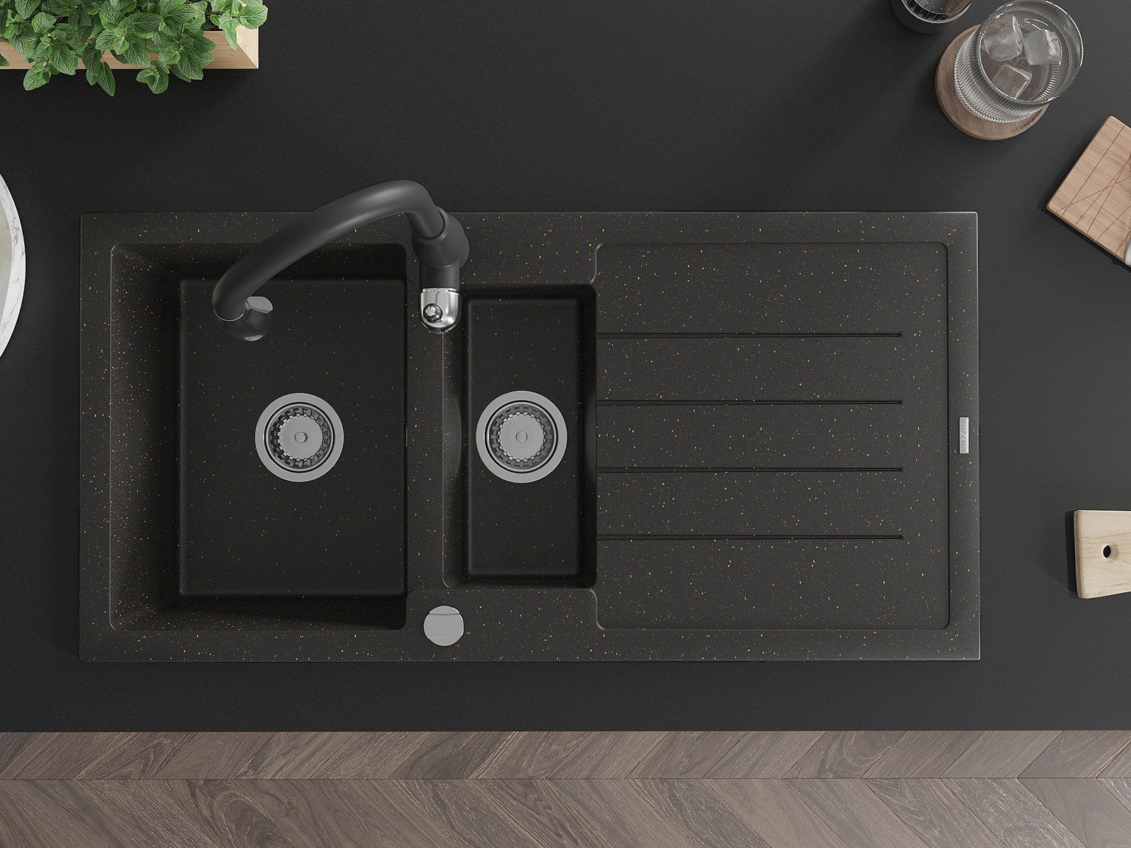 Mexen Andres granitizlietne 1,5-kameru ar notecētāju un virtuves jaucējkrānu Savita, melns/zelta metālisks - 6515-75-672601-70