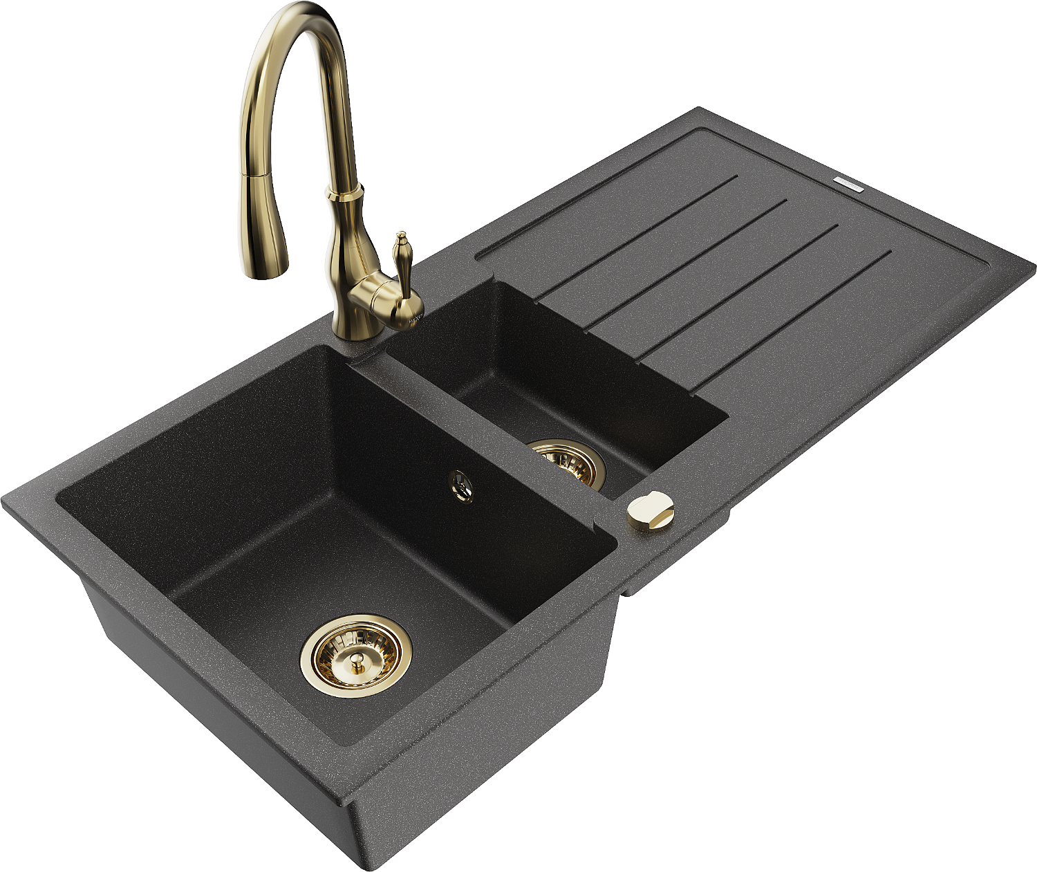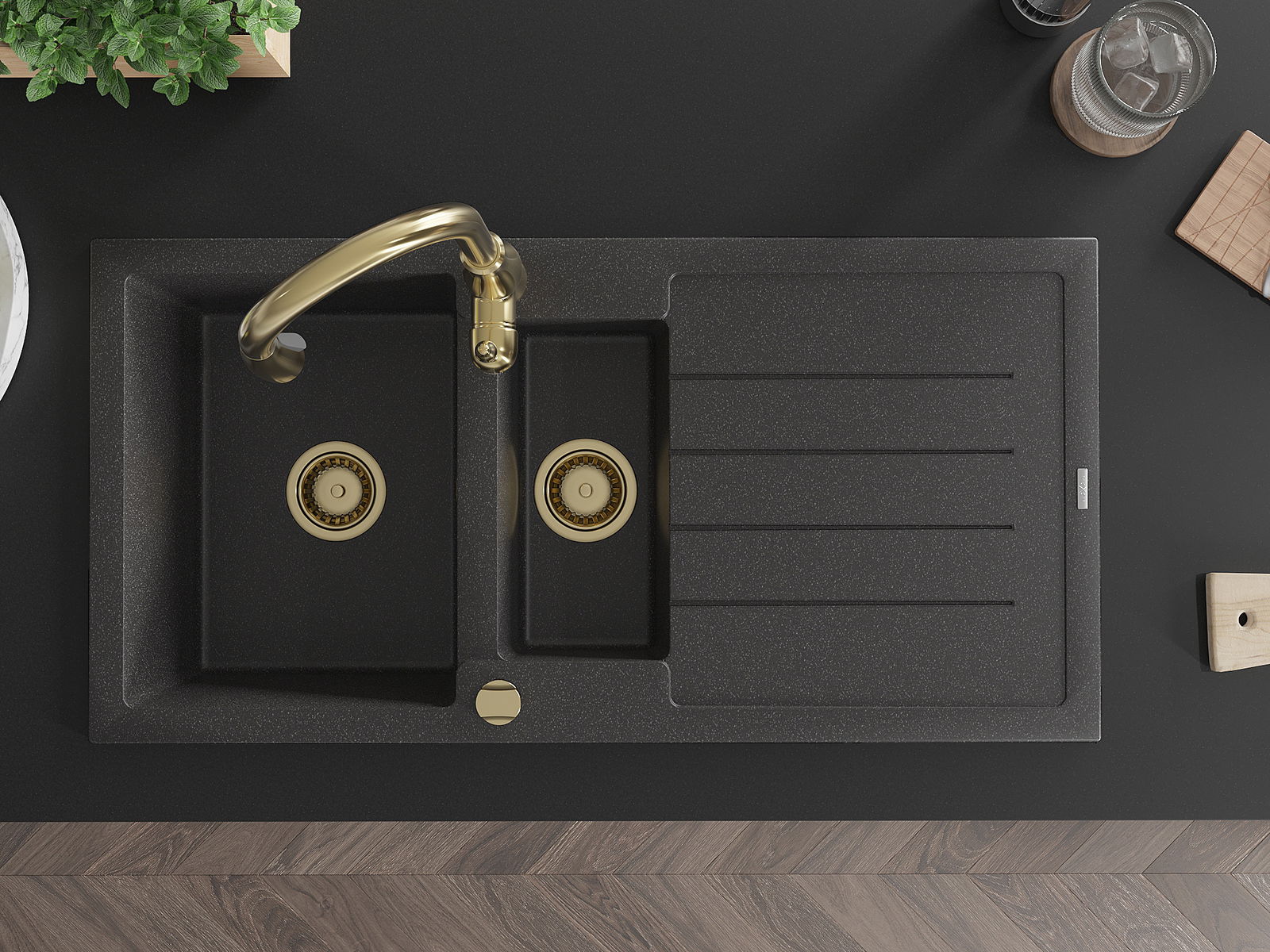 Mexen Andres 1,5 nodalījuma granīta izlietne ar drenāžu un virtuves jaucējkrānu Savita, melns ar punktiem - 6515-76-672601-50