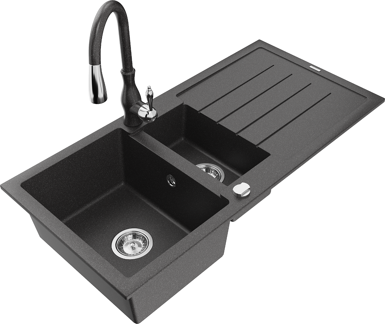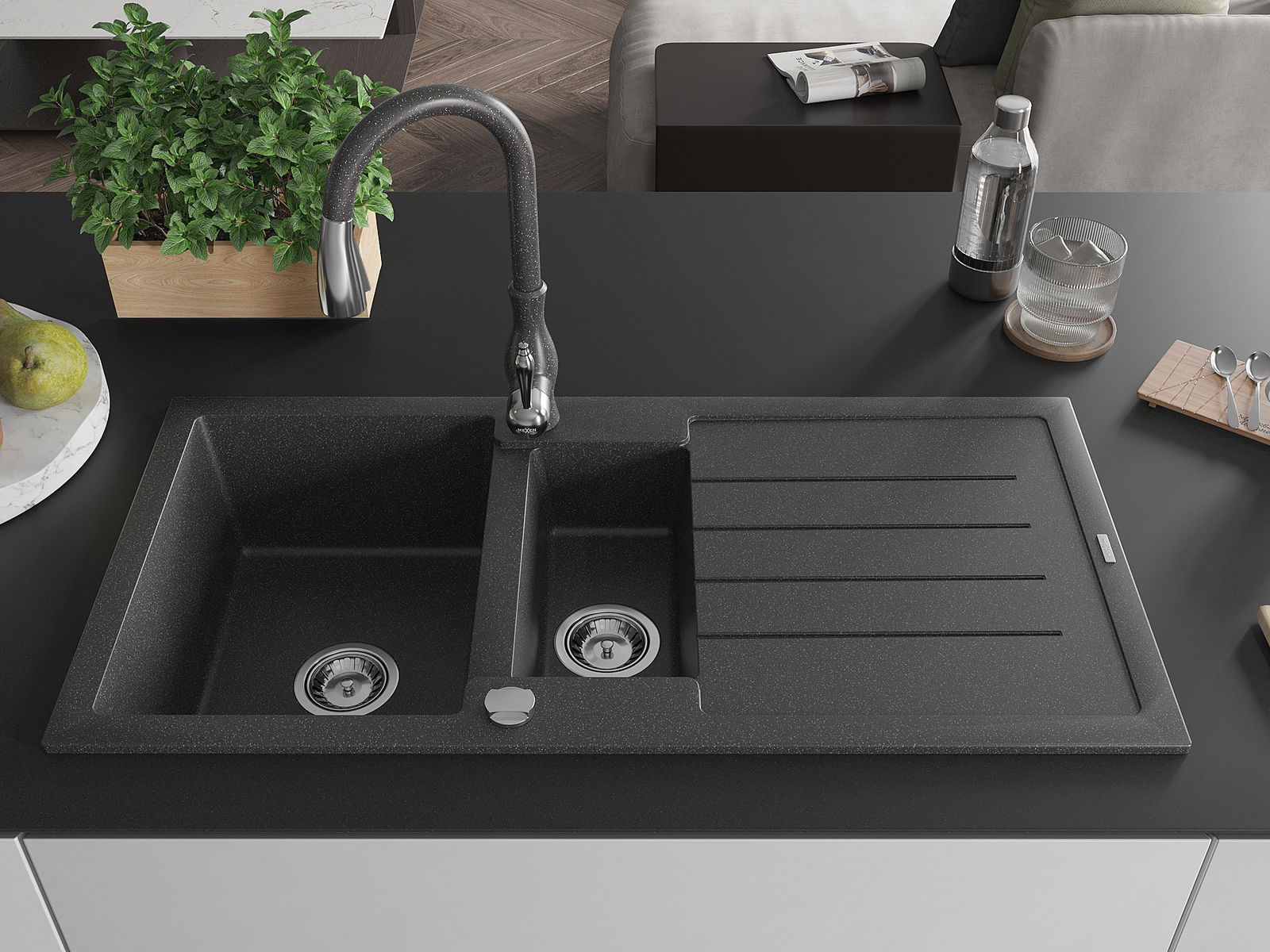 Mexen Andres granit izlietne ar 1,5 kameru, ar noteci un virtuves jaucējkrānu Savita, melna ar plankumiņiem