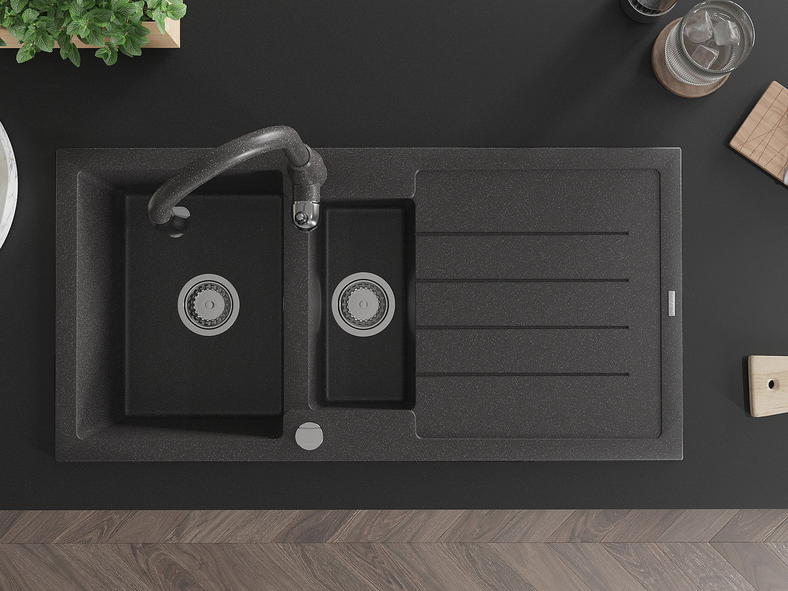 Izlietnei ir 2 daļēji izurbtas atveres ar diametru 35 mm, kuras var pašrocīgi izsist. Tās var izmantot, piemēram, šķidruma dozatora uzstādīšanai, kas novērsīs plastmasas pudeļu klātbūtni virtuvē un piešķirs tai elegantu apdari.