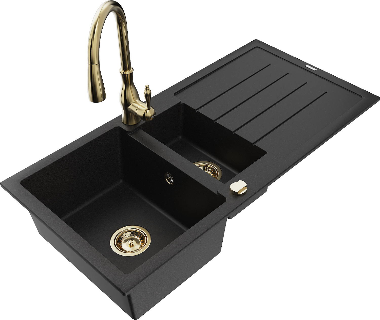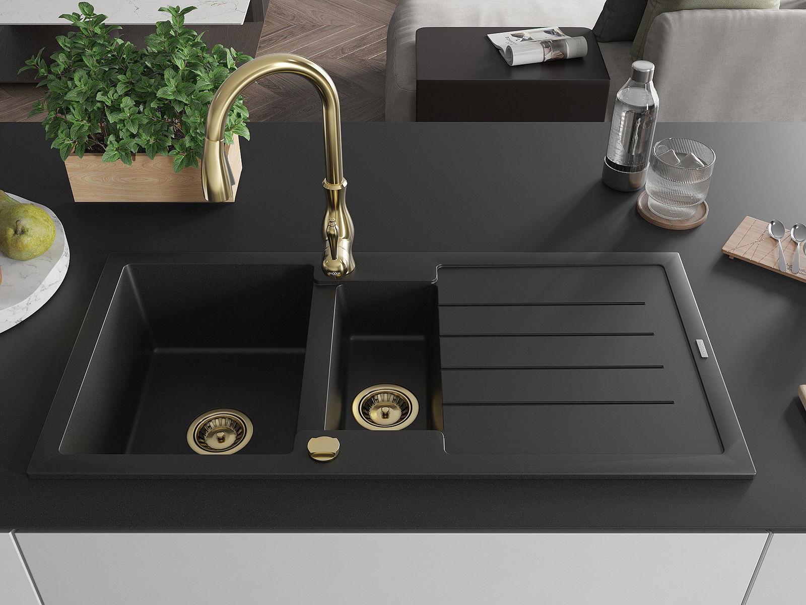 Mexen Andres Granta izlietne ar 1,5 nodalījumu un noteces zonu ar virtuves jaucējkrānu Savita, melna - 6515-77-672601-50