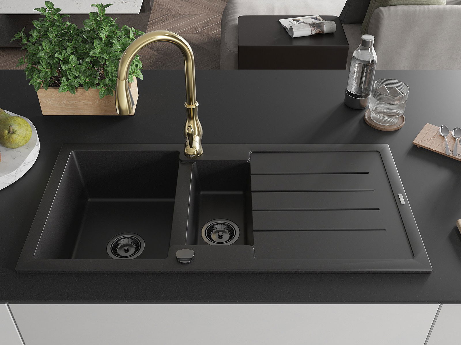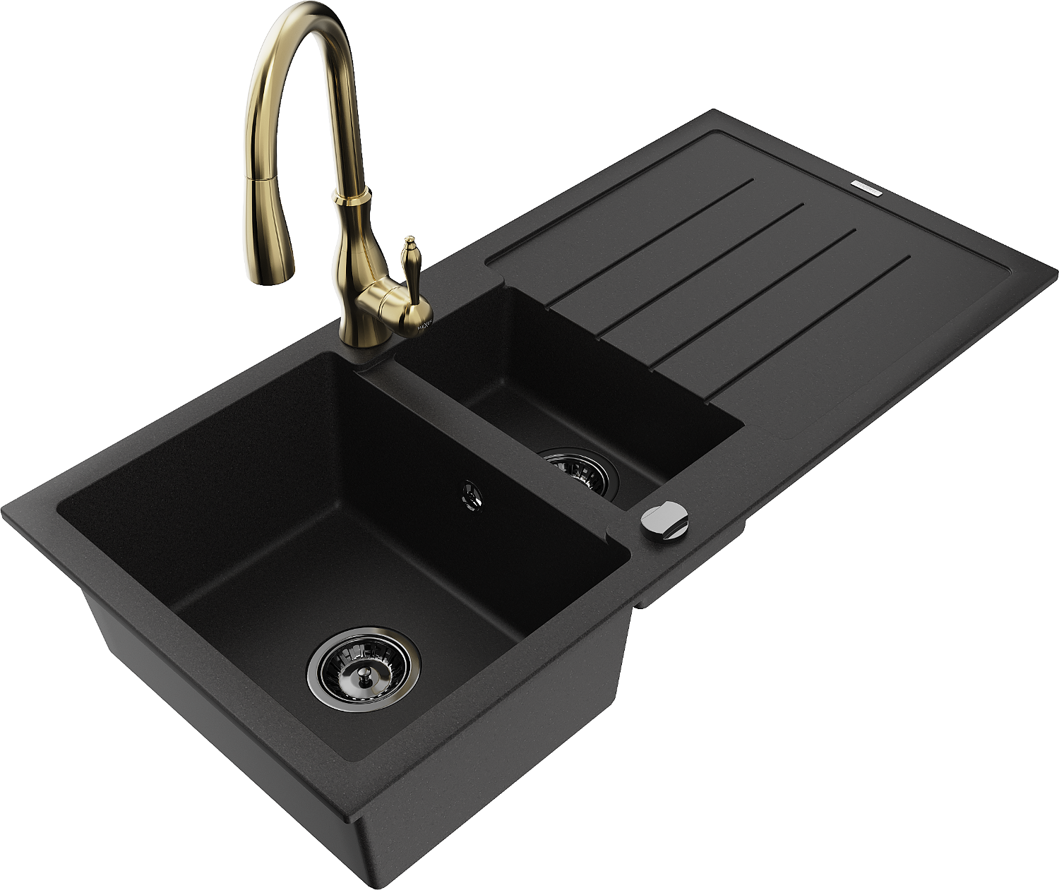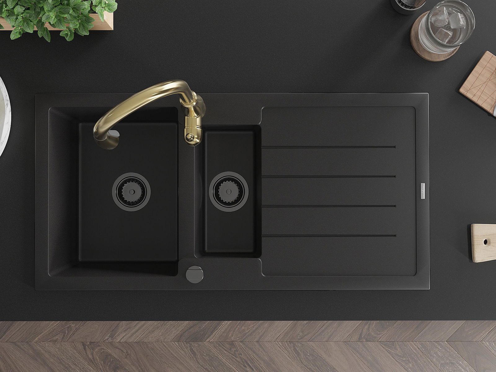 Mexen Andres 1,5-kameru granīta izlietne ar noteces vietu un virtuves jaucējkrānu Savita, melna - 6515-77-672601-50-B
