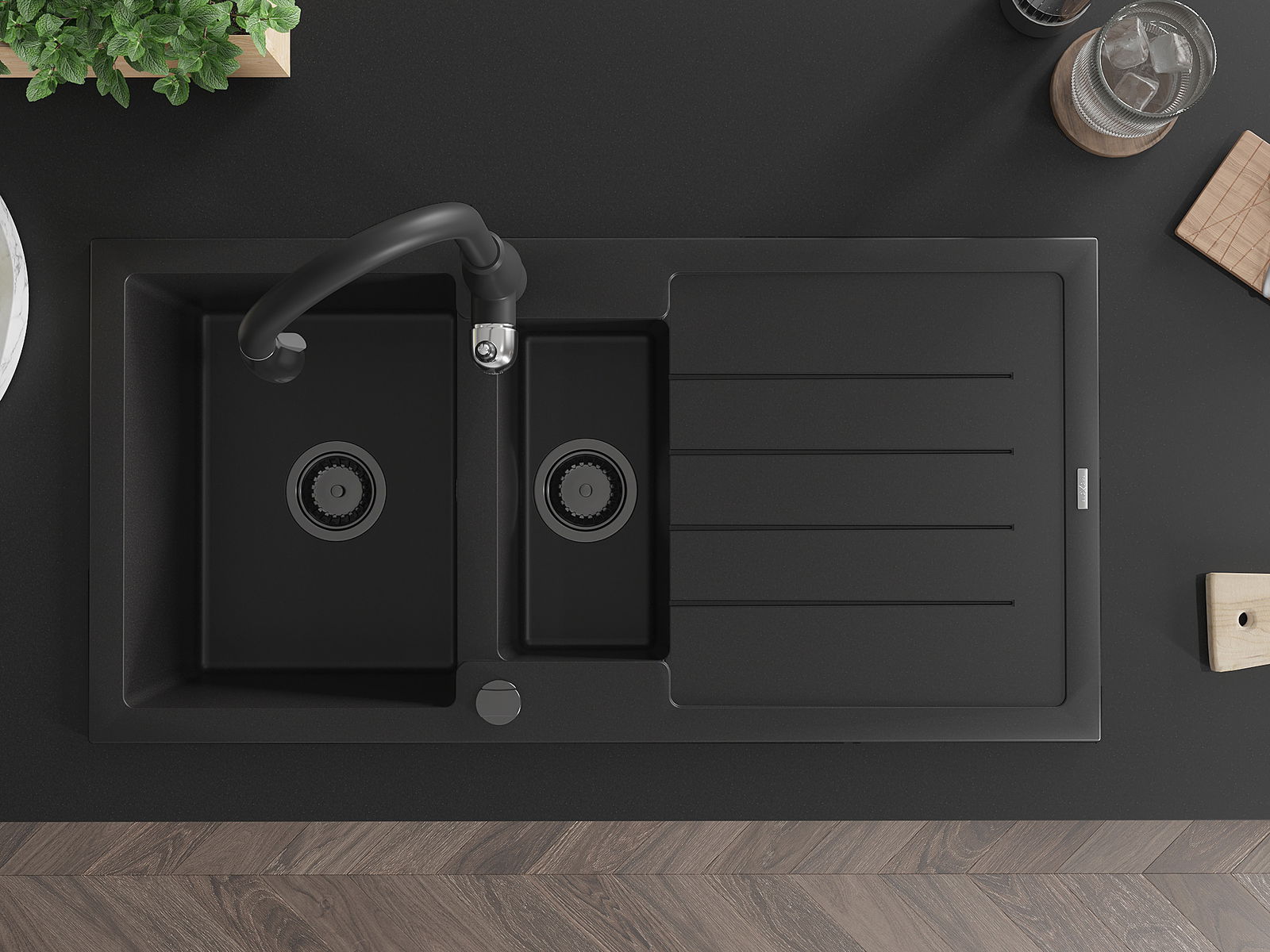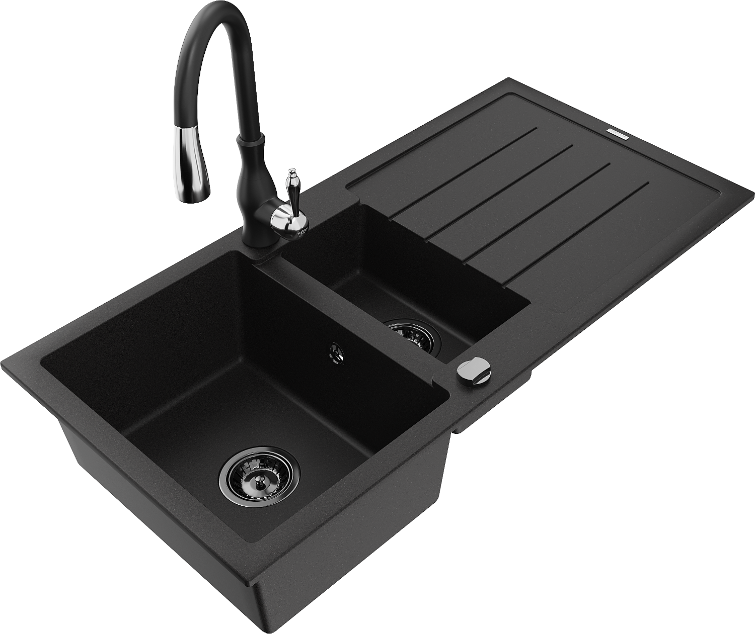 Mexen Andres 1,5 nodalījuma granīta izlietne ar notekpaplātni un virtuves jaucējkrānu Savita, melna - 6515-77-672601-70-B