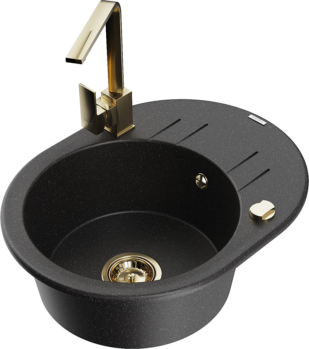 Mexen Kevin granīta izlietne ar vienu nodalījumu, noteces vietu un virtuves jaucējkrānu Rita, melna/sudraba - 6517-73-670300-50