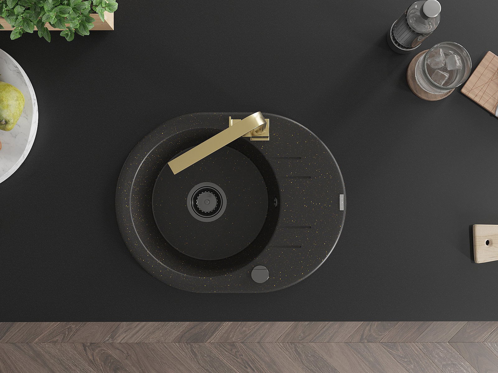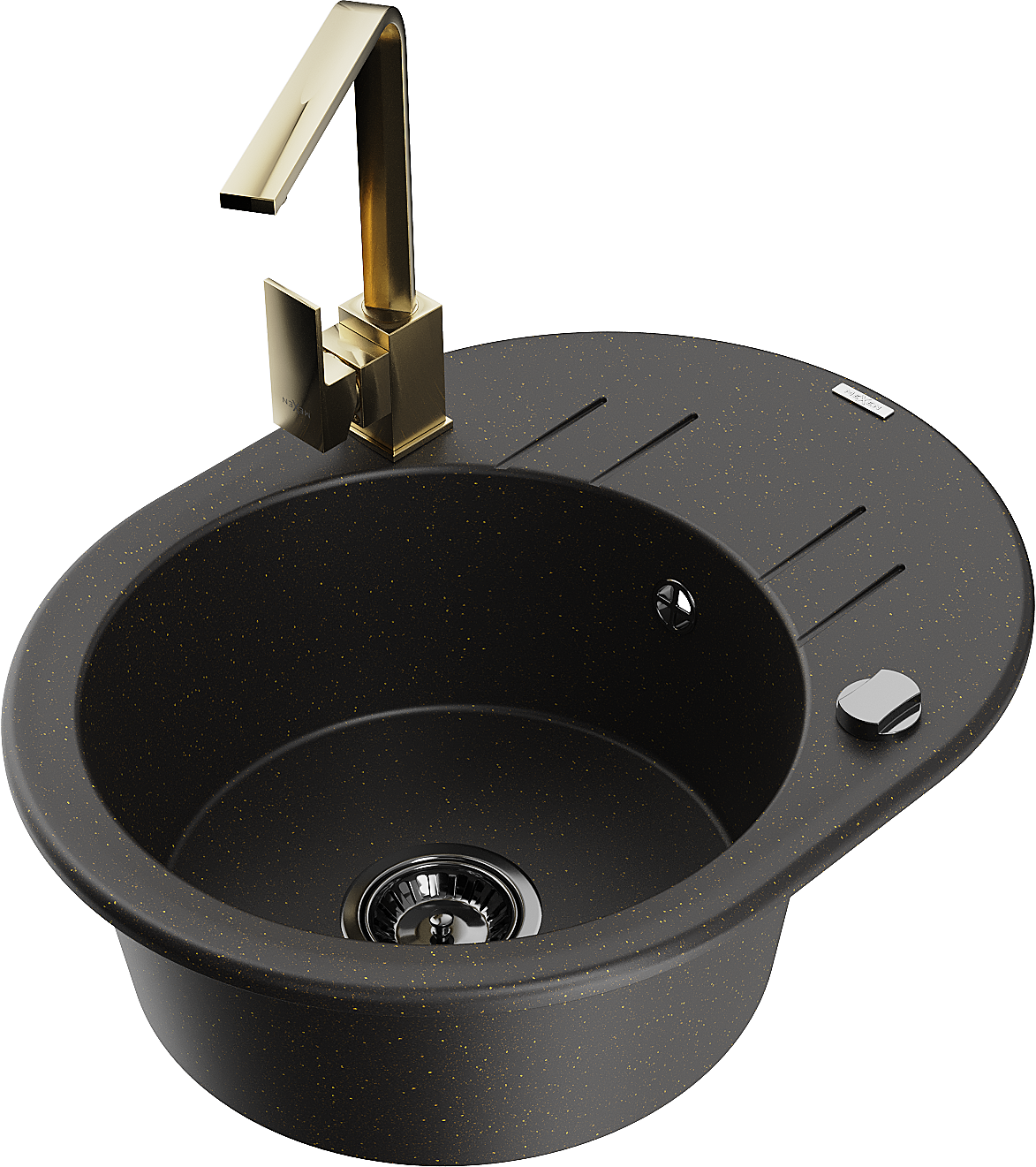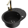 Mexen Kevin granitizlietne 1-kameras ar notecējumu un virtuves krānu Rita, melna/zeltaina metālika - 6517-75-670300-50-B