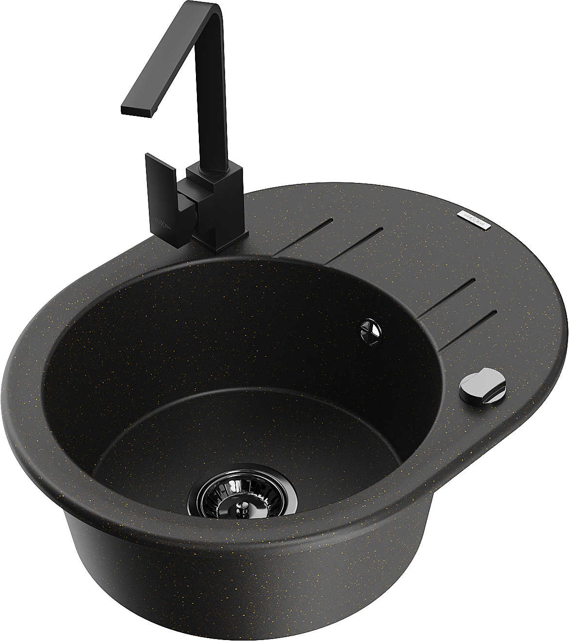 Mexen Kevin granitē izlietne 1-kameru ar notekas paneli un virtuves krānu Rita, melnā/zeltīta metāliks - 6517-75-670300-70-B
