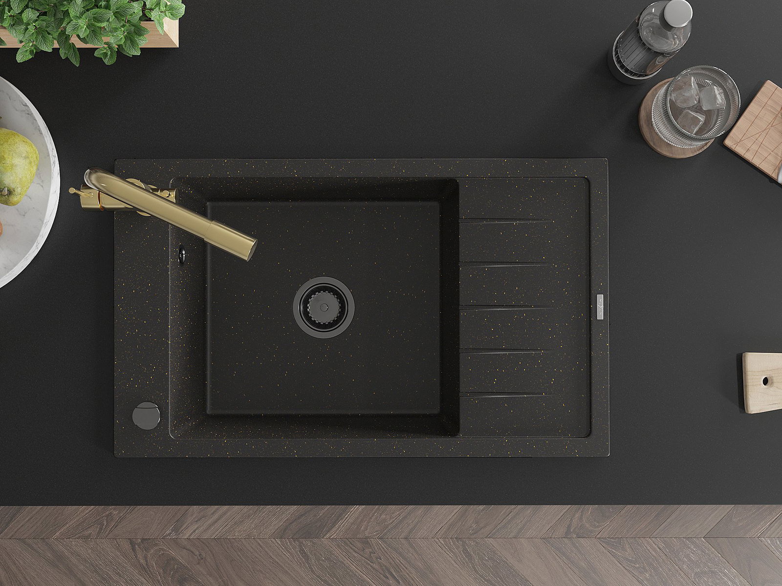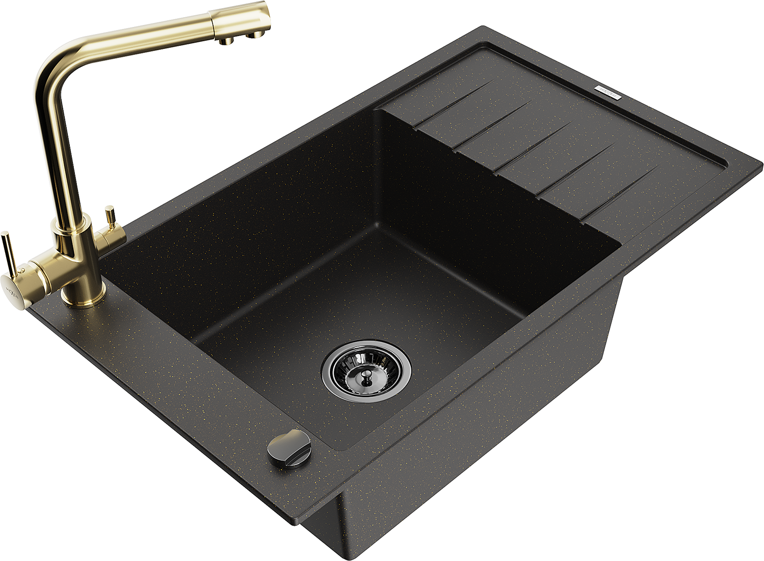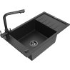 Mexen Elias 1 kameru granīta izlietne ar notekas un virtuves jaucējkrānu Duero, melns/zelta metālisks - 6511-75-671600-50-B