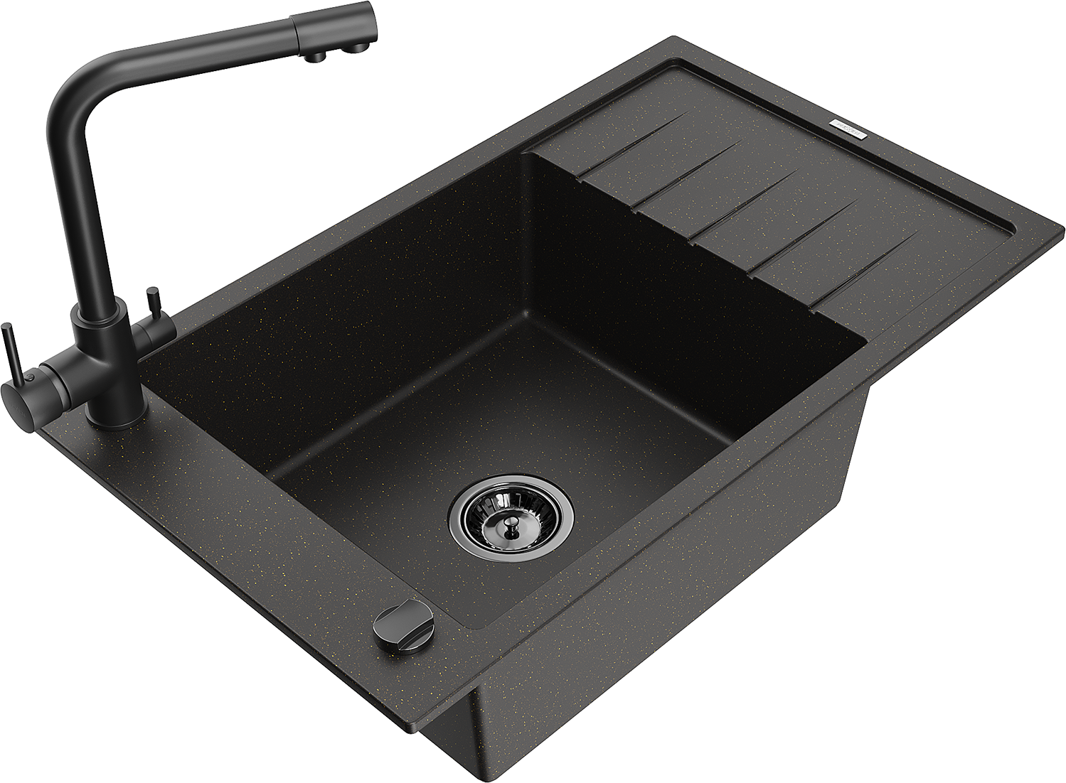 Mexen Elias Granitais izlietne ar vienu nodalījumu ar notecinātāju un virtuves jaucējkrānu Duero, melns/zeltains metālisks