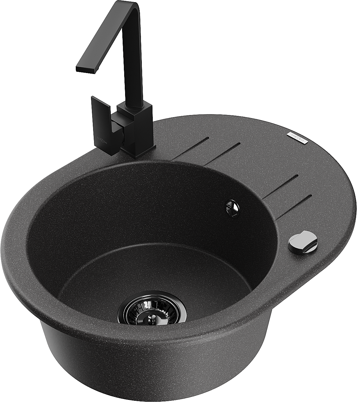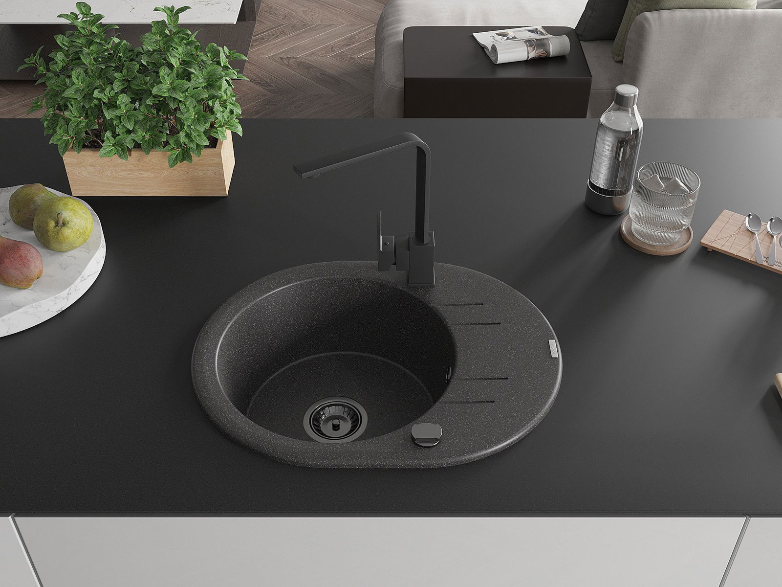 Mexen Kevin granīta izlietne ar vienu nodalījumu, noteces vietu un virtuves krānu Rita, melna ar pleķīšiem
