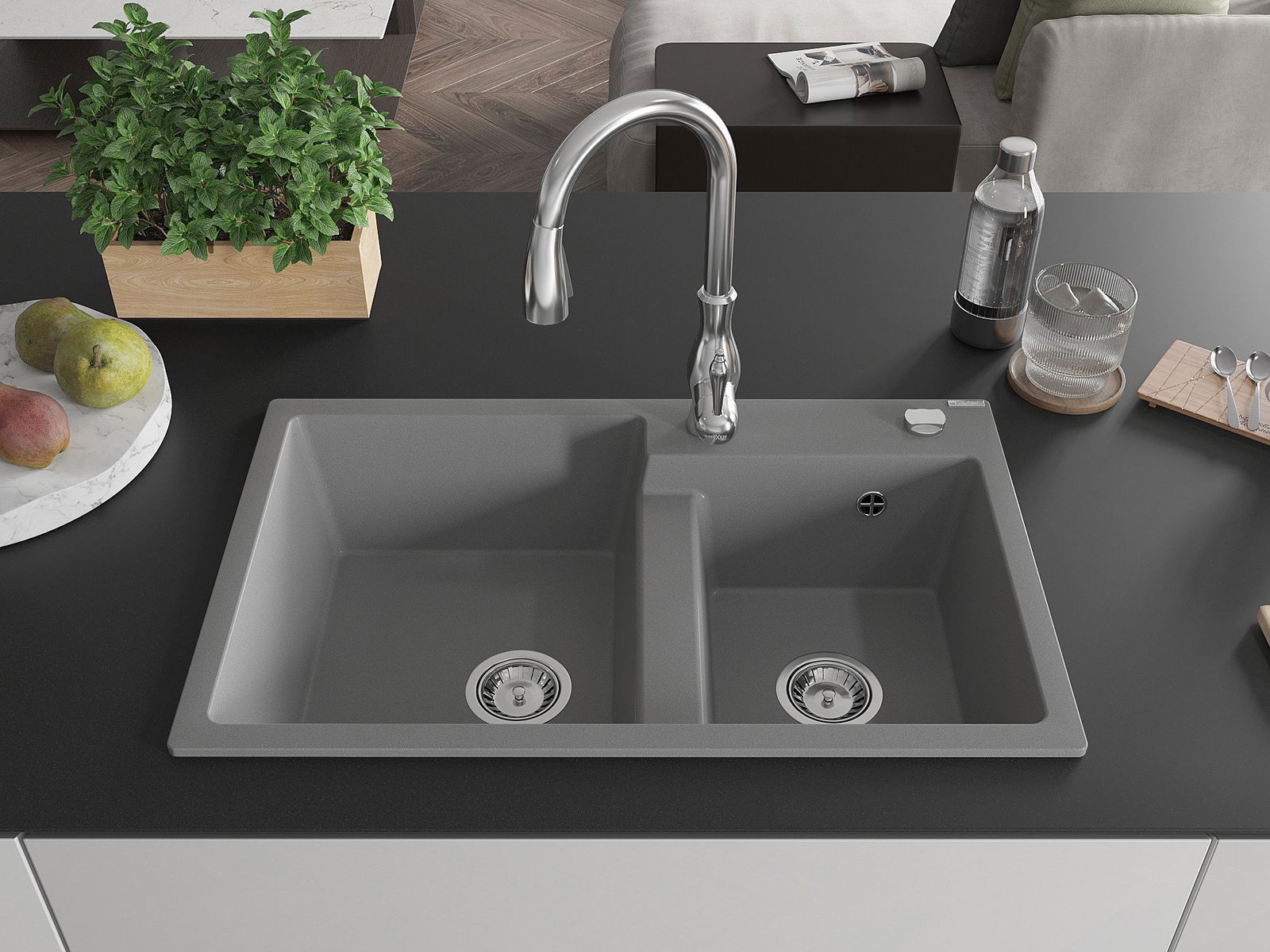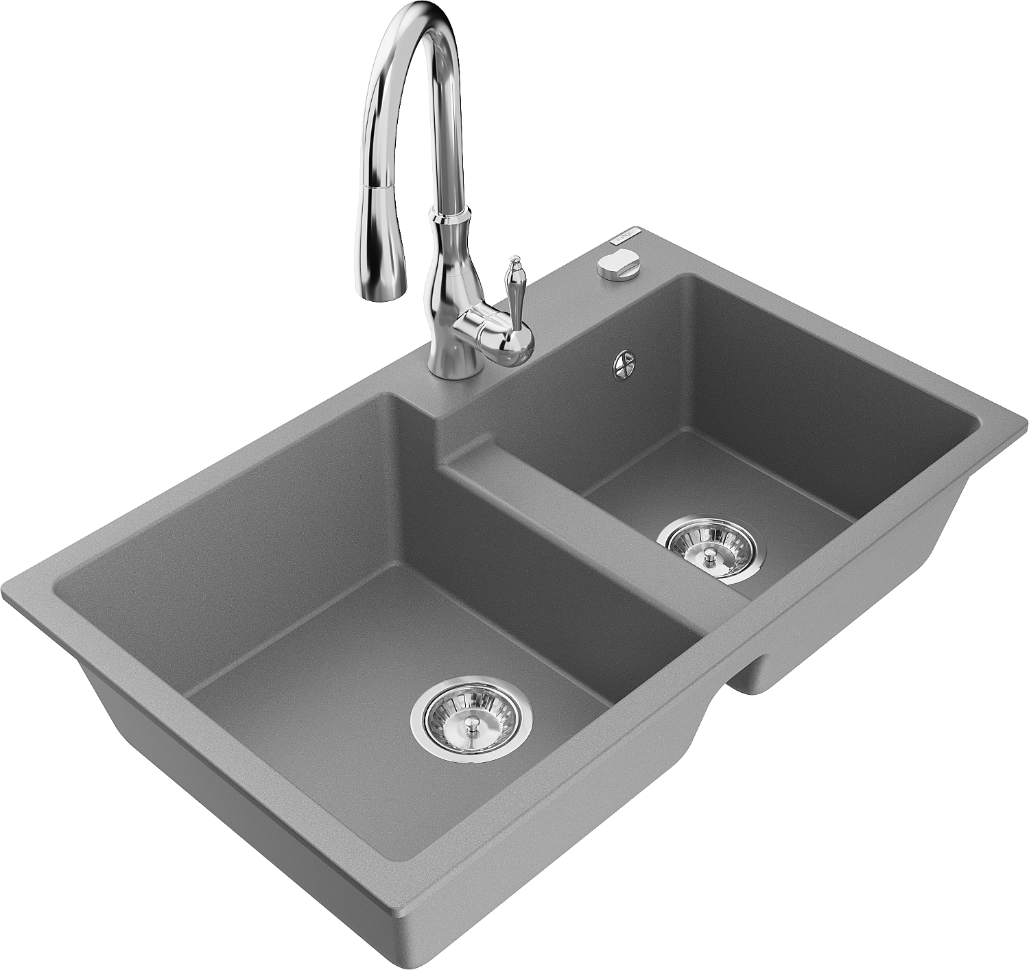 Mexen Tomas granitizlietne ar diviem nodalījumiem un virtuves jaucējkrānu Savita, pelēka - 6516-71-672601-00