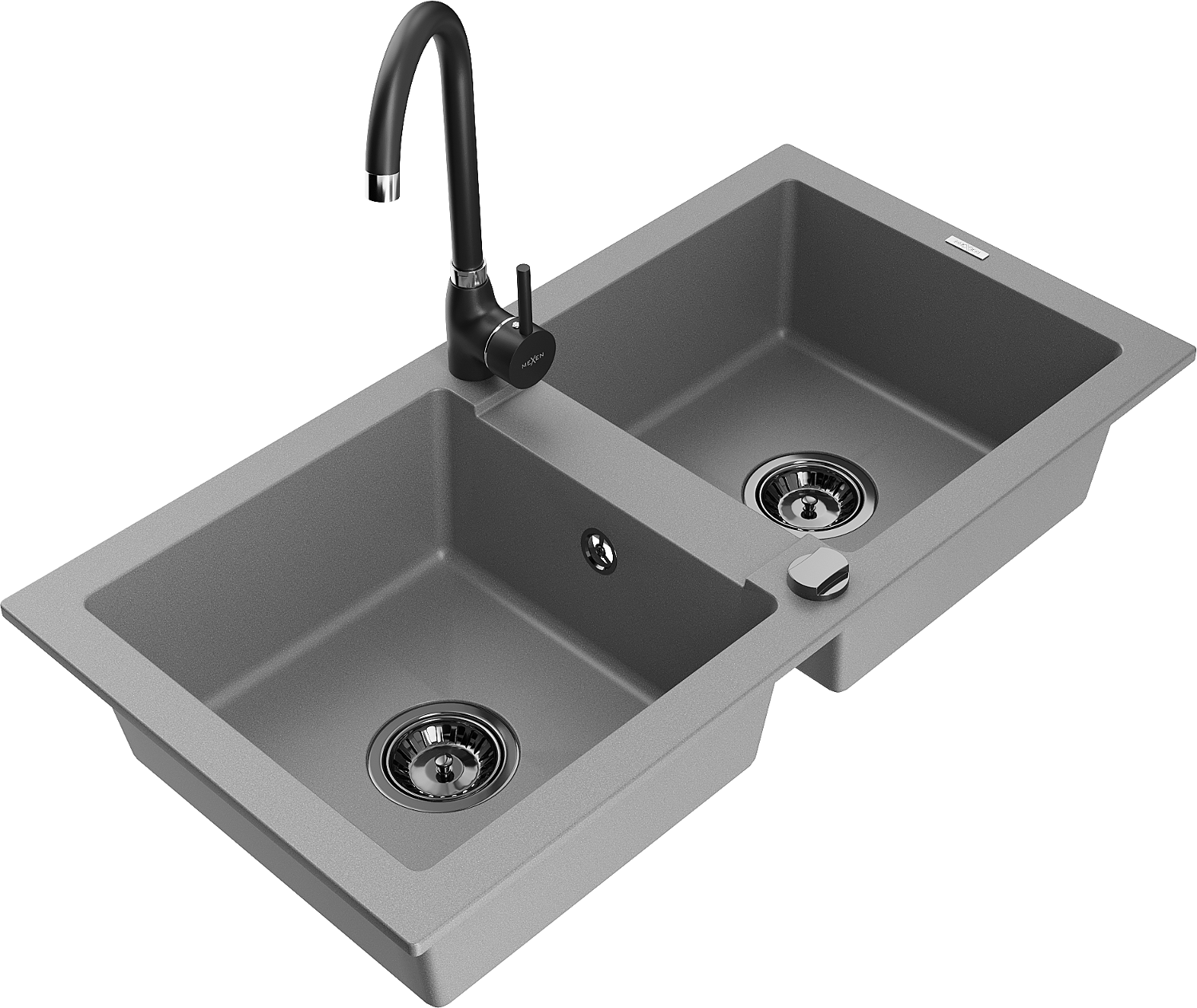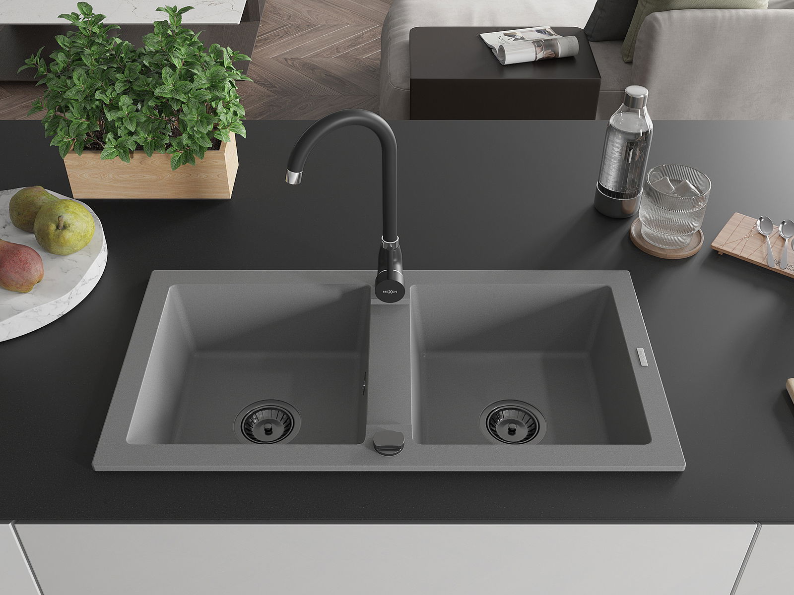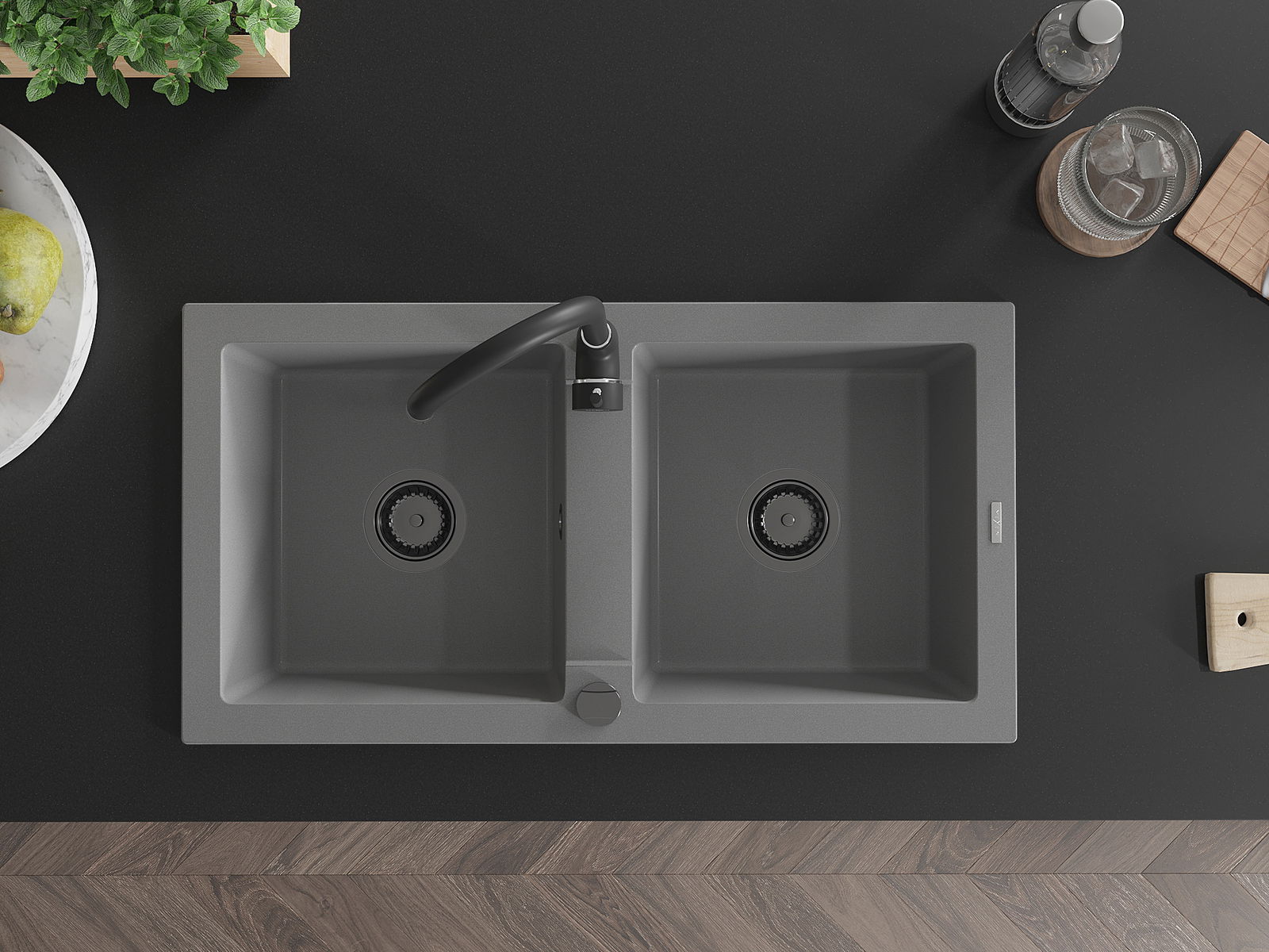 Mexen Mario divu nodalījumu granīta izlietne ar virtuves jaucējkrānu Telma, pelēka - 6504-71-670200-70-B