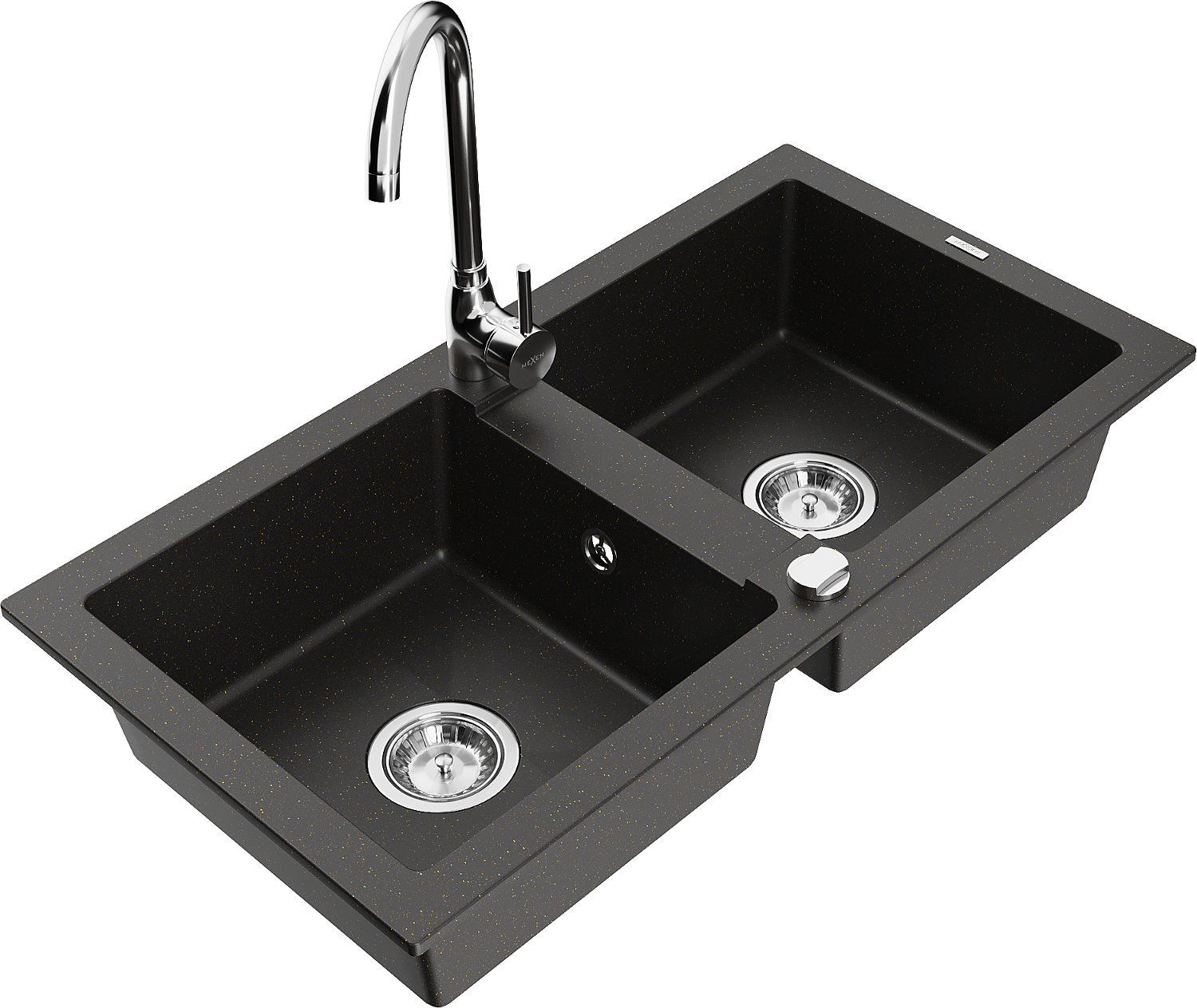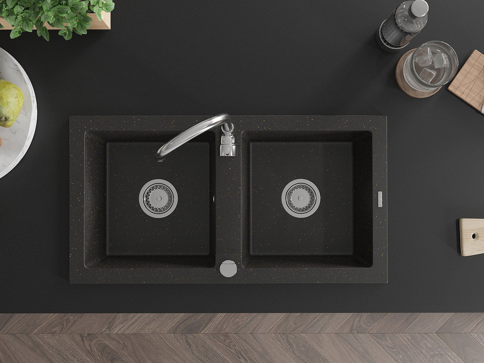 Mexen Mario granitizlietne ar 2 nodalījumiem un virtuves jaucējslēdzi Telma, melna/zeltaina - 6504-75-670200-00