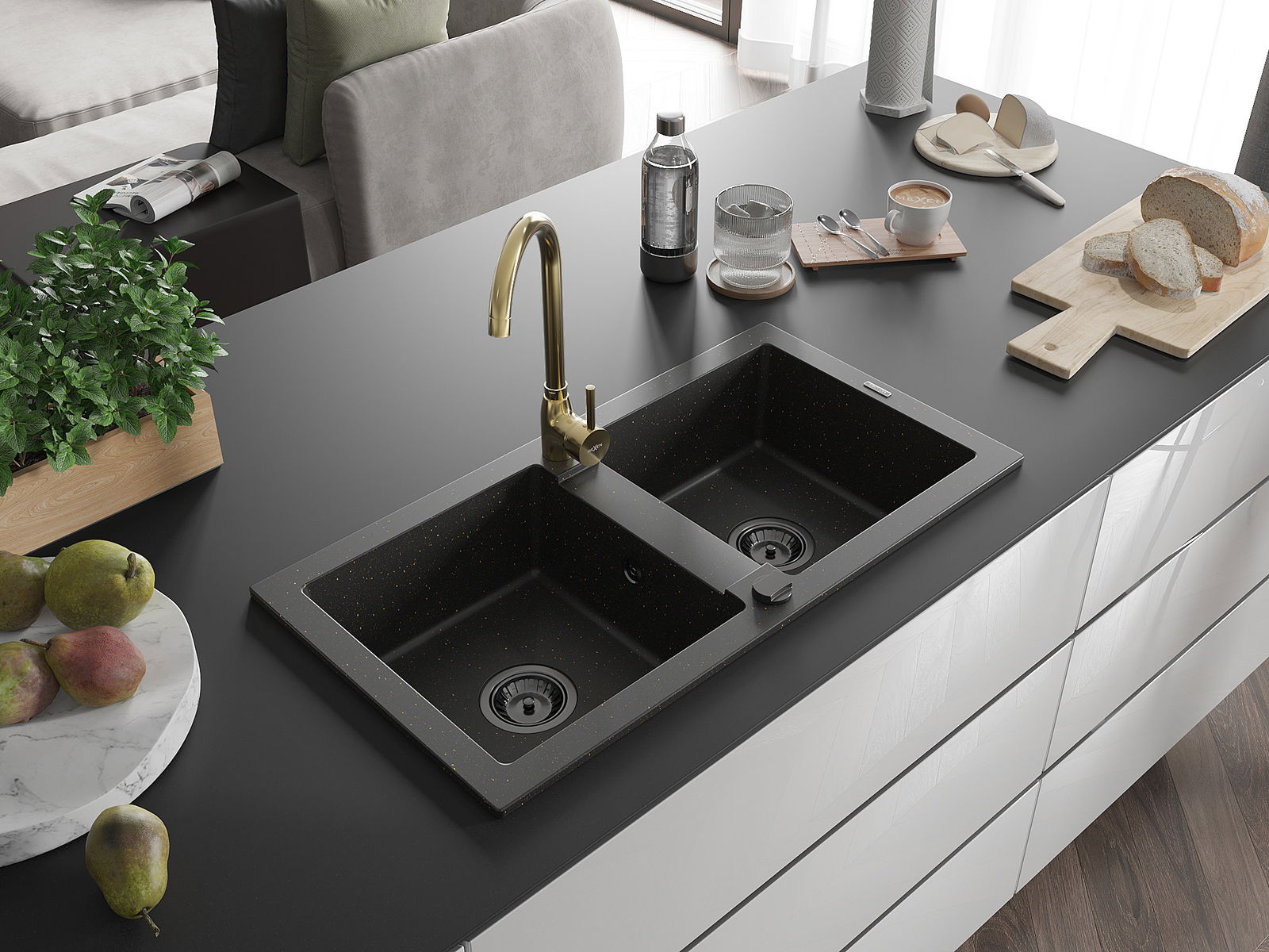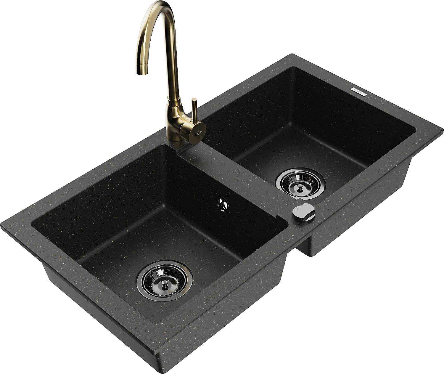 Mexen Mario granitīgs divkameru izlietne ar virtuves jaucējkrānu Telma, melns/zeltains - 6504-75-670200-50-B