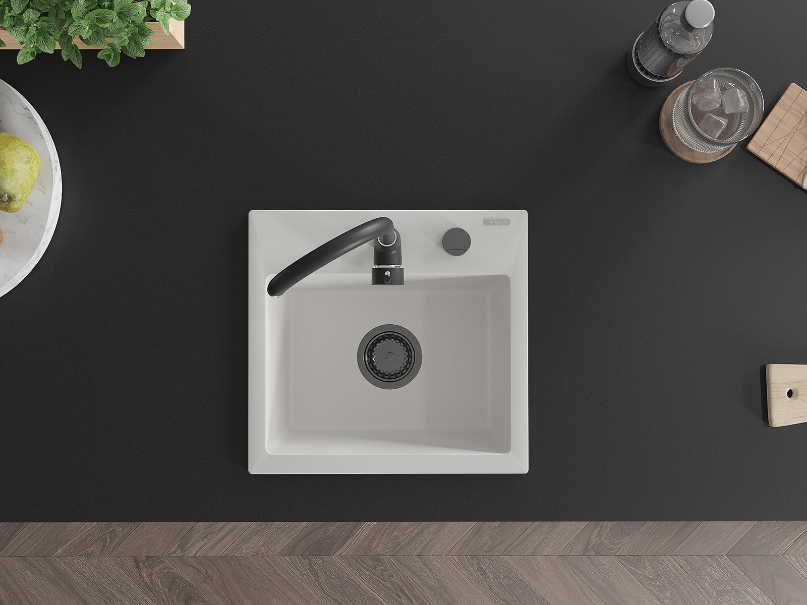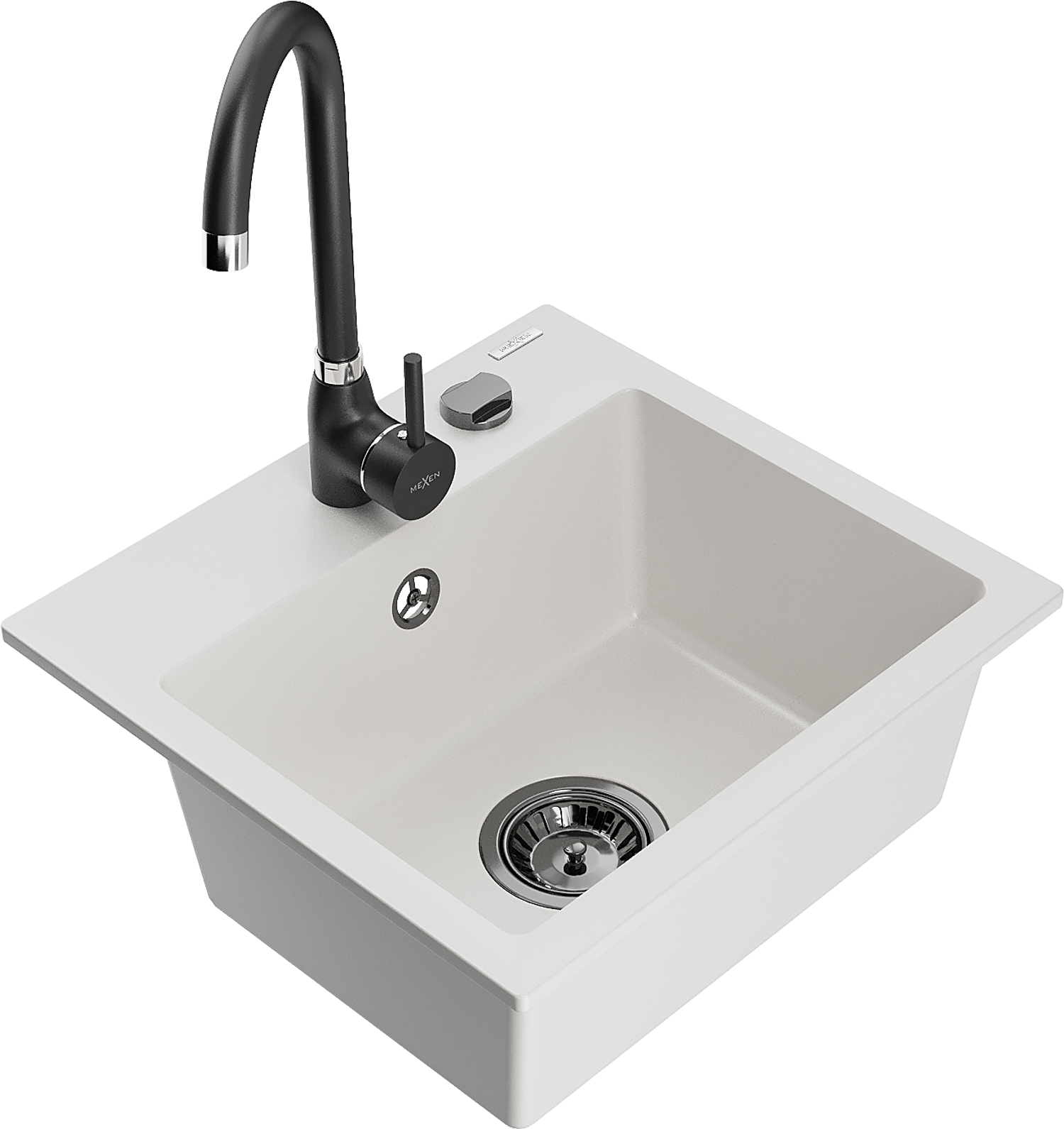 Mexen Milo granīta virtuves izlietne ar vienu nodalījumu un Telma virtuves jaucējkrānu, balta - 6505-20-670200-70
